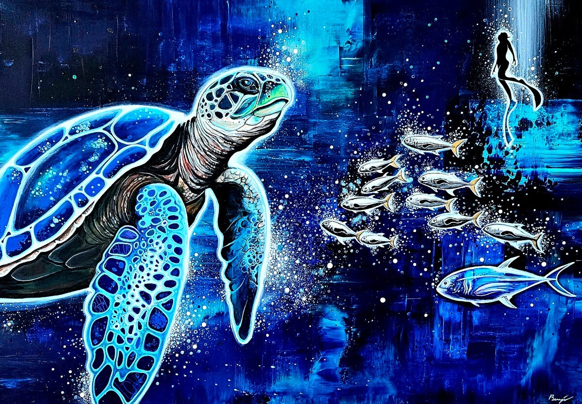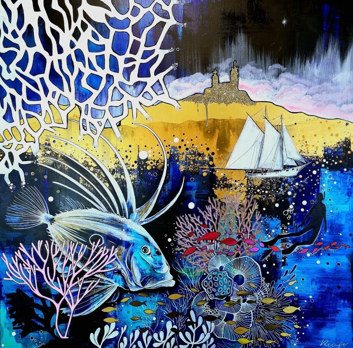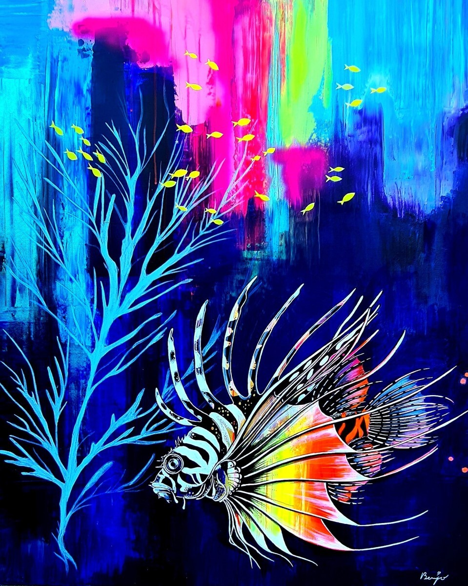 Au détour de ses œuvres, Benjo vous invite dans sa vision de la nature, de Marseille et ses îles, des calanques de la Côte Bleue qui se miroitent dans une Méditerranée réinventée. Ou la flore et la faune marine et terrestre s'harmonisent dans des décors délirants, comme pour en souligner leur beauté éphémère et leur extrême fragilité.