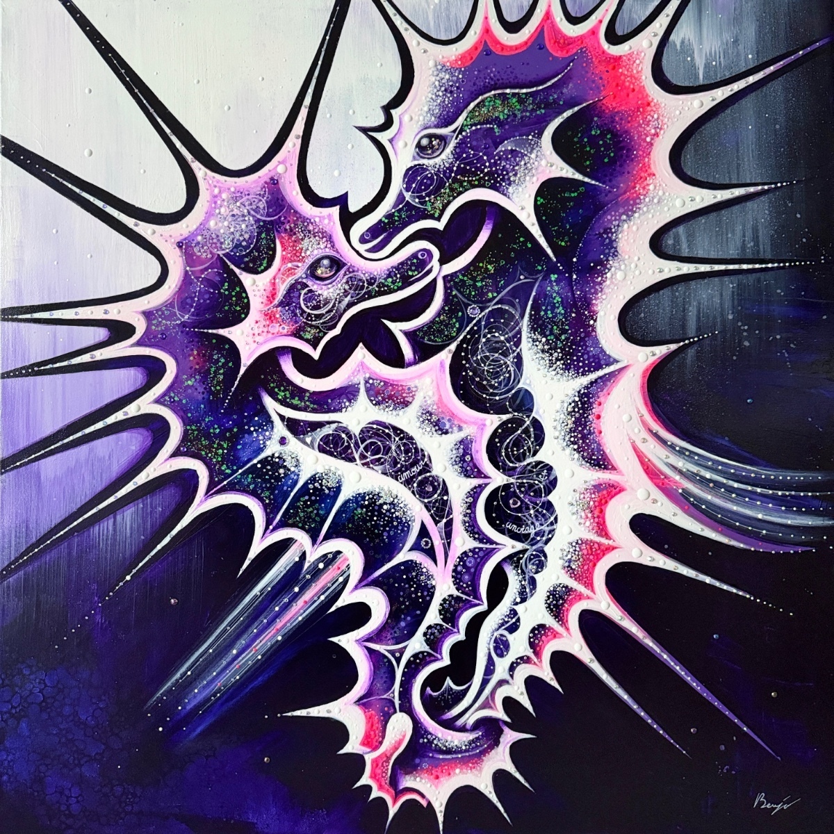 C'est en 2012 que cet artiste a commencé à s'exprimer sur toile en utilisant principalement la peinture acrylique mais pas seulement… Dans une recherche perpétuelle d'authenticité cet artiste n'hésite pas à inclure dans ses œuvres le collage et à inventer de nouvelle méthodes… telle cette usage plutôt original d'une carte de crédit pour étendre la couleur des arrière-plans picturaux !