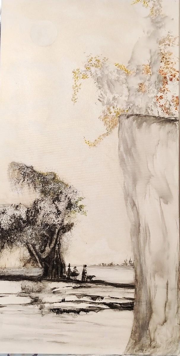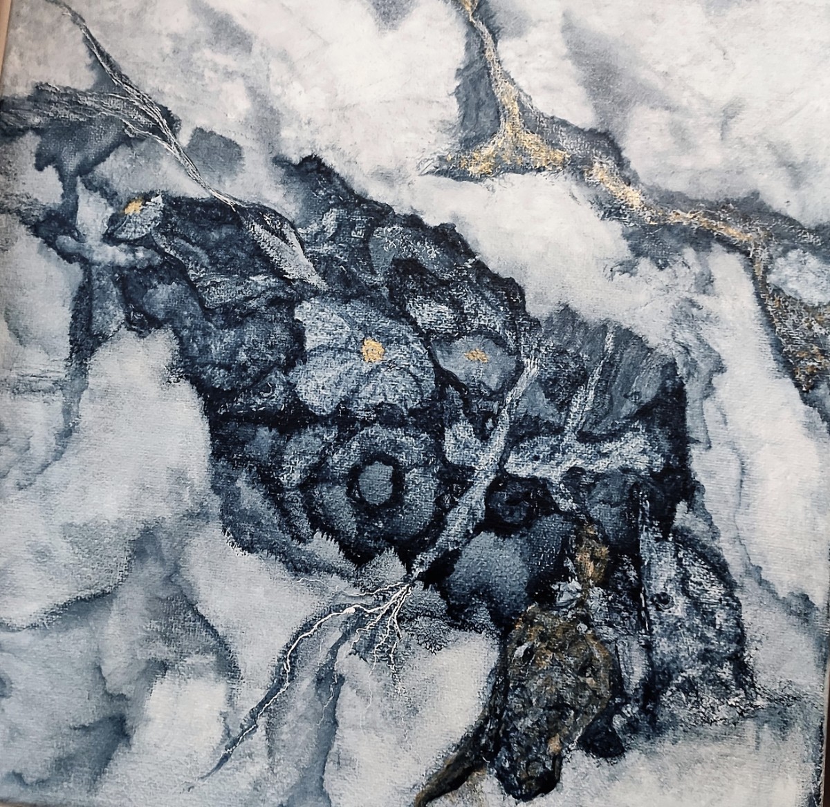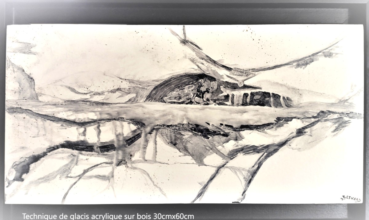 Au cours de mes différents chantiers, de patines en trompe l’œil, j’ai expérimenté beaucoup de techniques picturales (glacis, matières, etc...) Ce qui m'a amenée tout naturellement à développer une démarche artistique autour de la recherche de formes, de profondeurs dans les glacis acryliques.