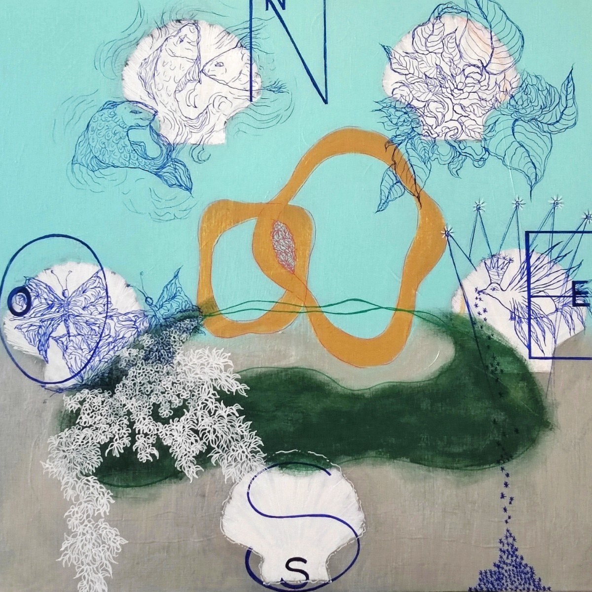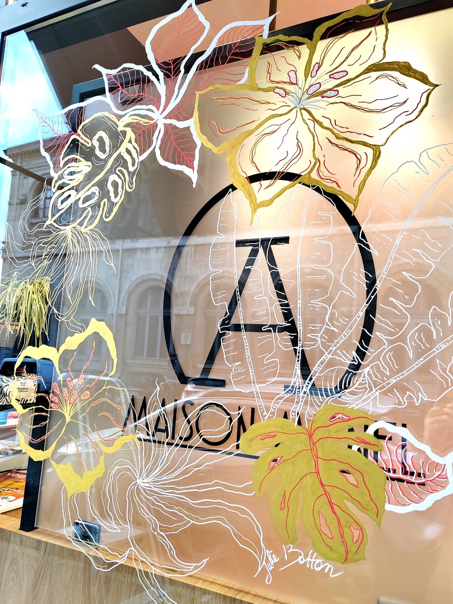 Ses oeuvres sont inspirées et nourries de ses voyages ,comme le mystérieux et profond Japon, ou la végétation abondante et la nature sacralisées , sont présentes par les couleurs , l'énergie de ses paysages et la vibration de ses animaux. Elle apprécie tout particulièrement le travail subtil de dessin floral et végétal, ainsi que les symboles,que l'on retrouve sur son travail de décor de vitrines et également dans son travail pictural.