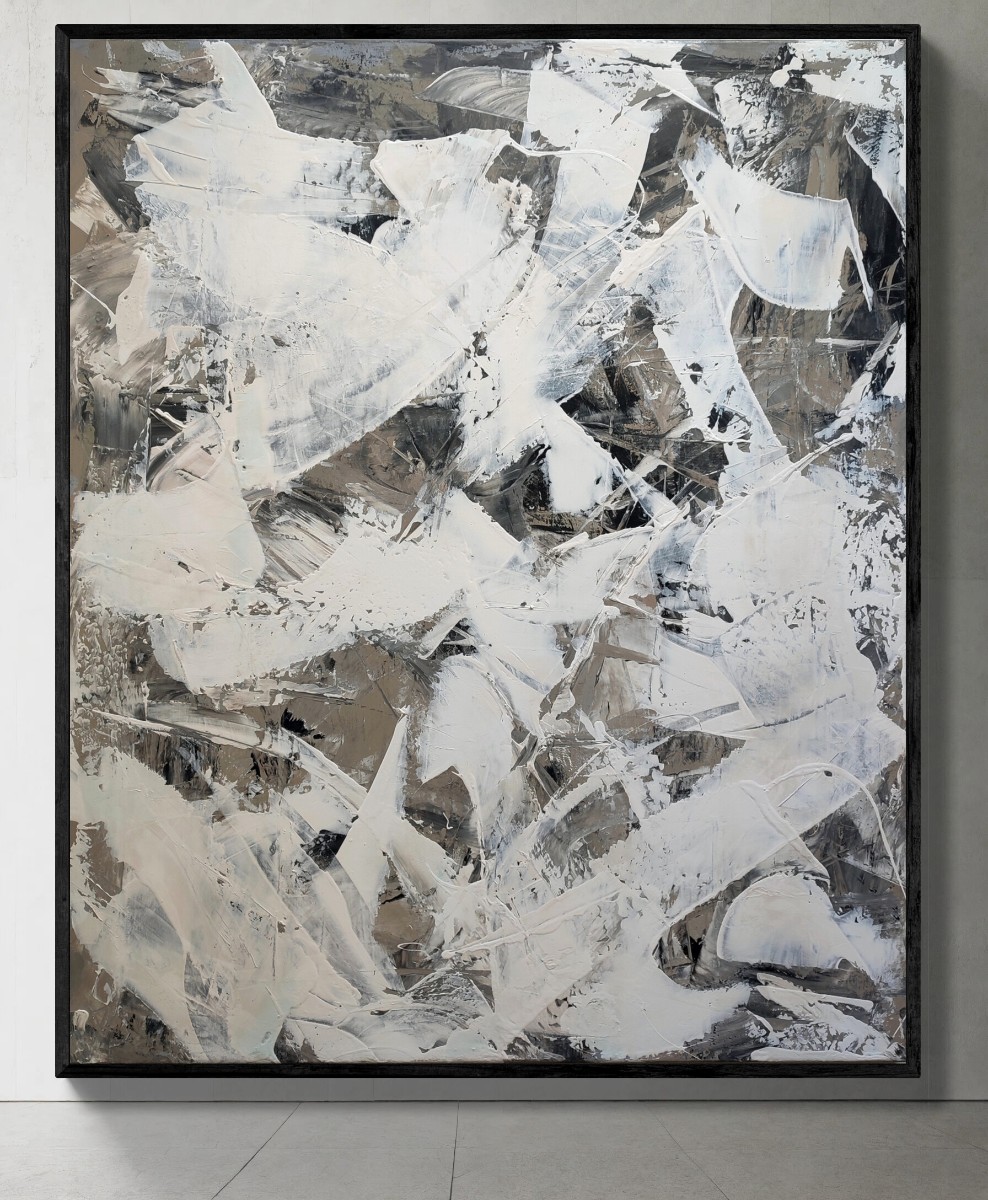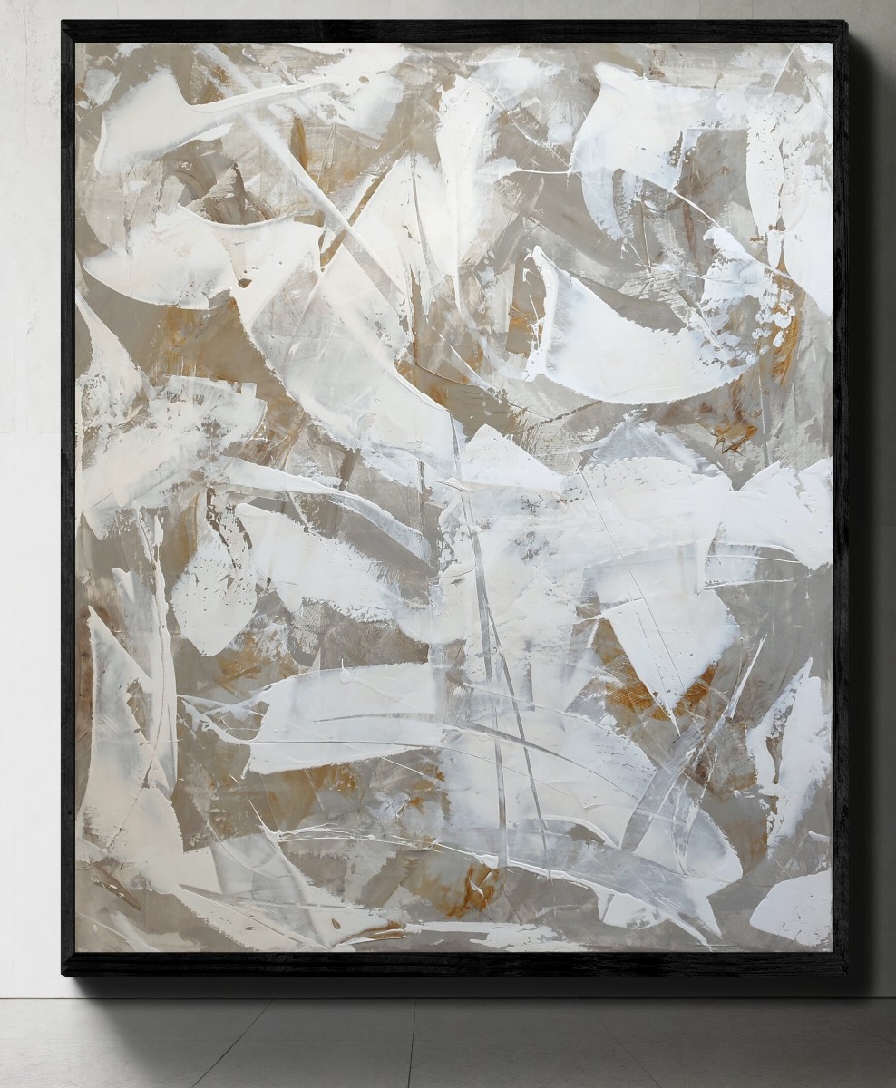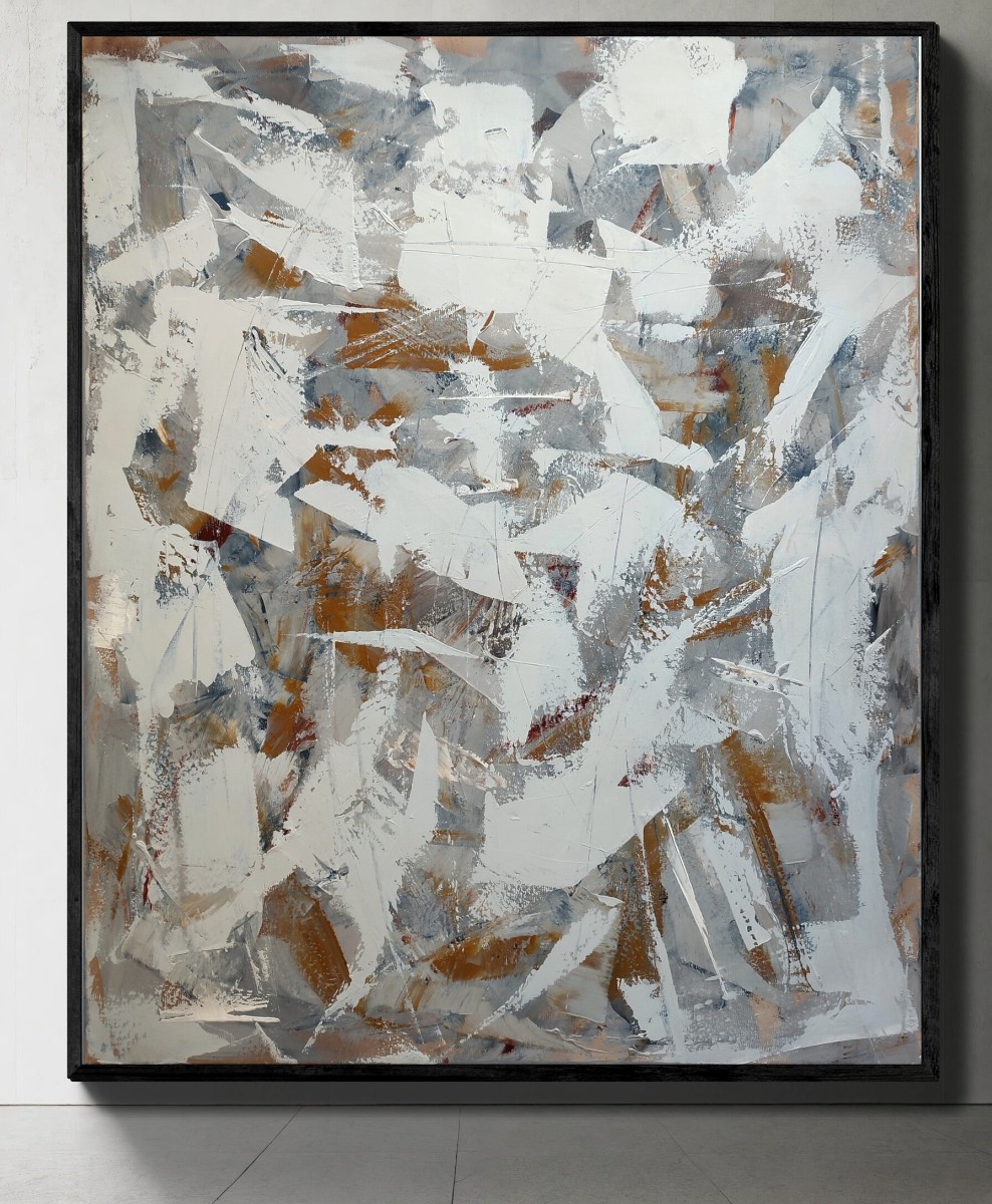 Puis l'envie de peindre s'est imposée à lui. Il travaille sur une toile enduite et poncée, peinte à l'acrylique et encollée, sur laquelle il dépose des feuilles de laiton doré. Le résultat est abstrait, lyrique, minimaliste, poétique, vivant et très moderne. L'or lui donne un côté précieux.