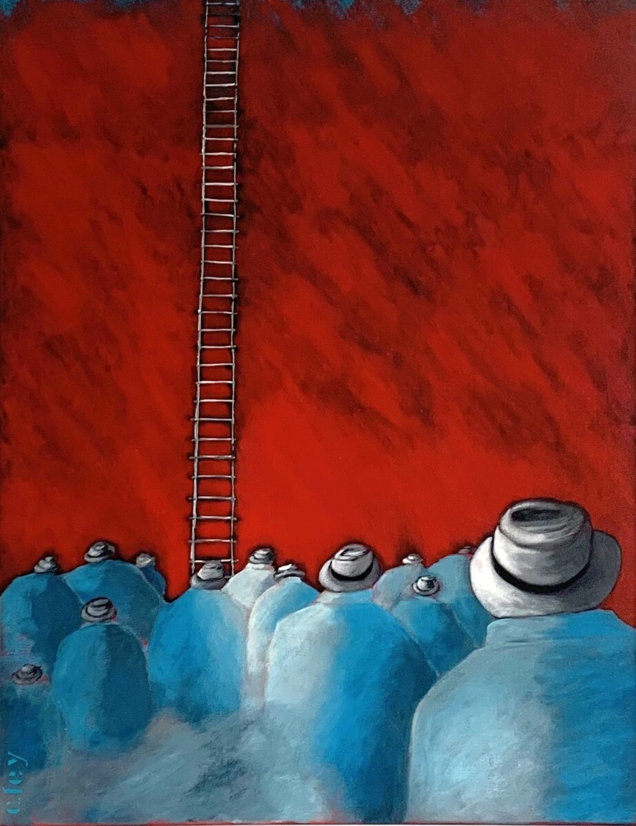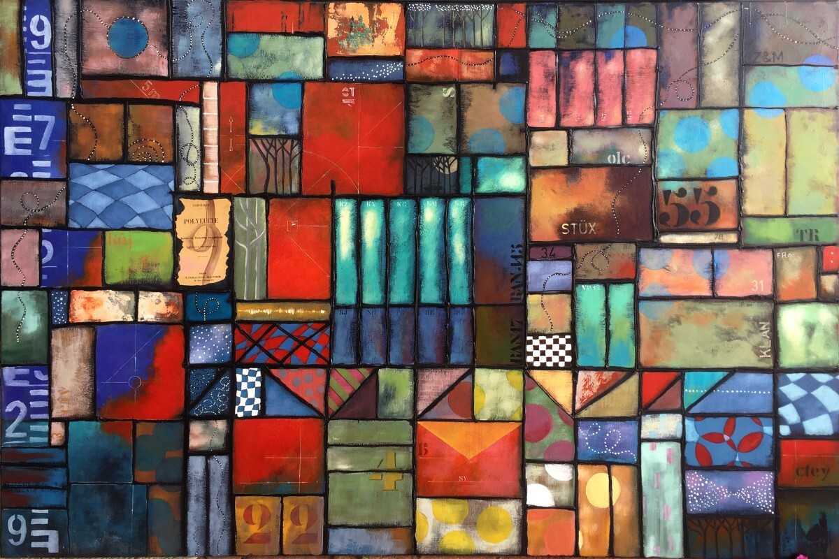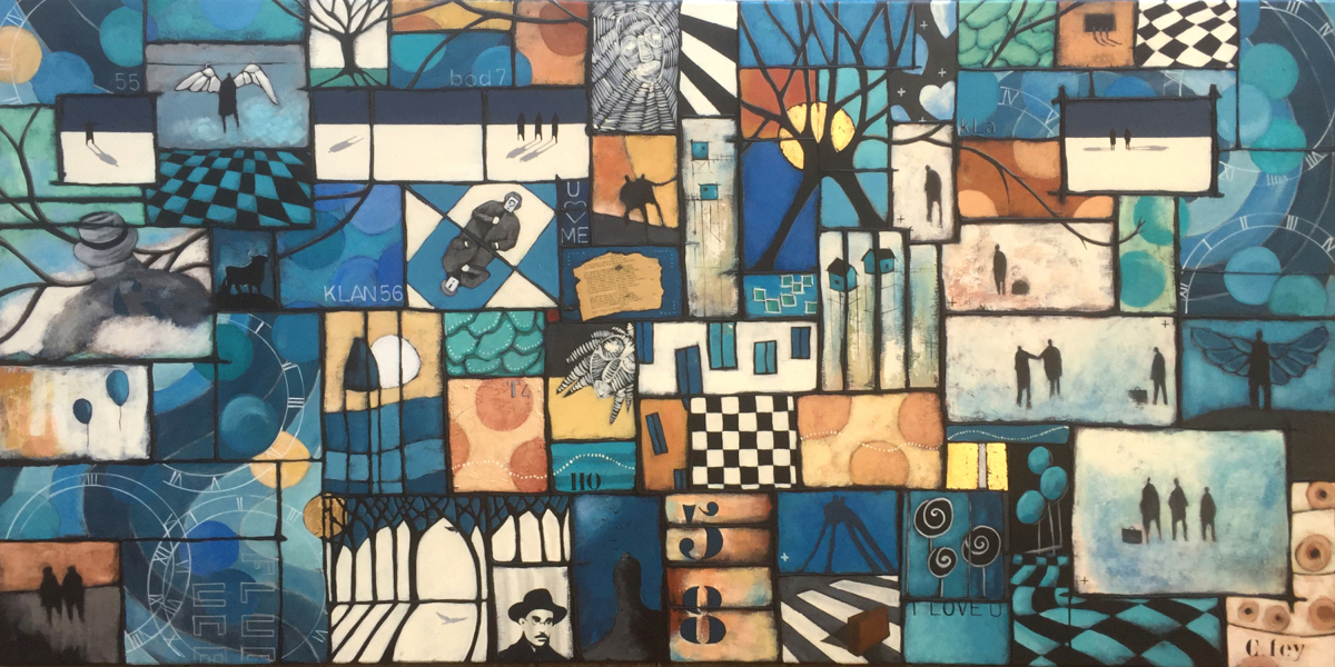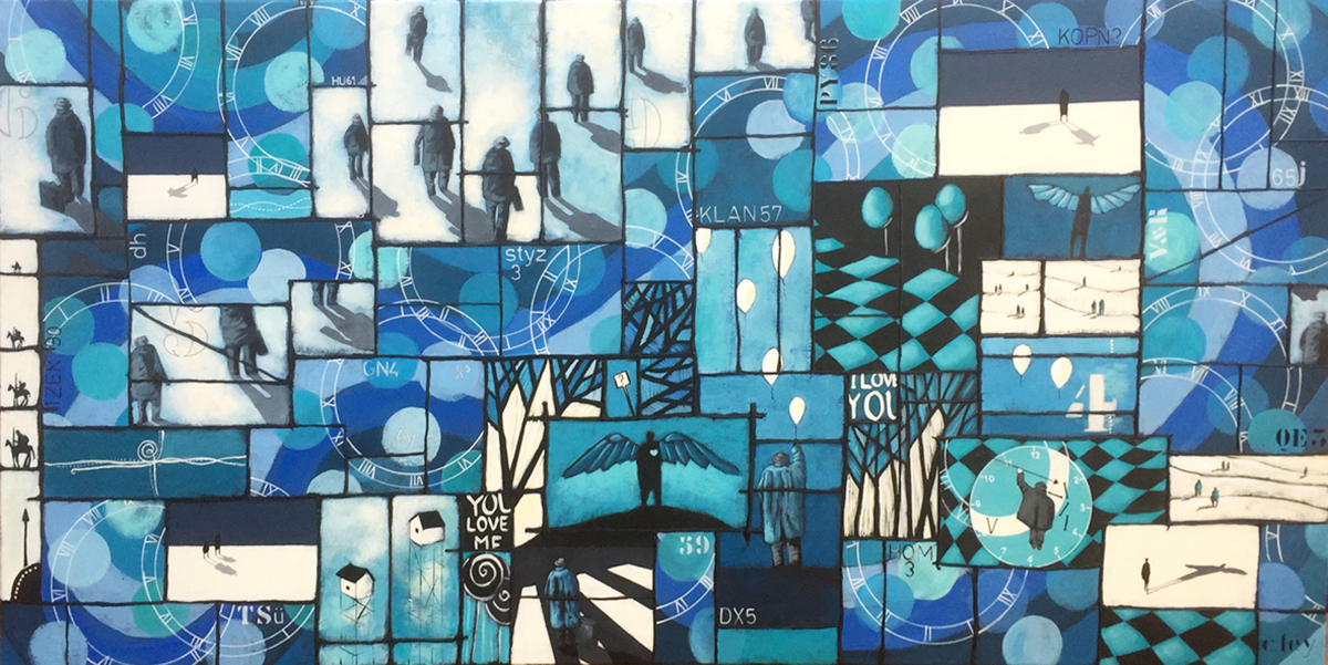 KLAN 57Acrylique sur toile 160x80- prix environ 4000 euros Dans la série : KLAN ,j'aime l'idée d'un monde mosaïque où tous les états se superposent. Joyeux bazar d’instants et d’émotions qui réunit pèle mêle les personnages et les diverses idées qui me t