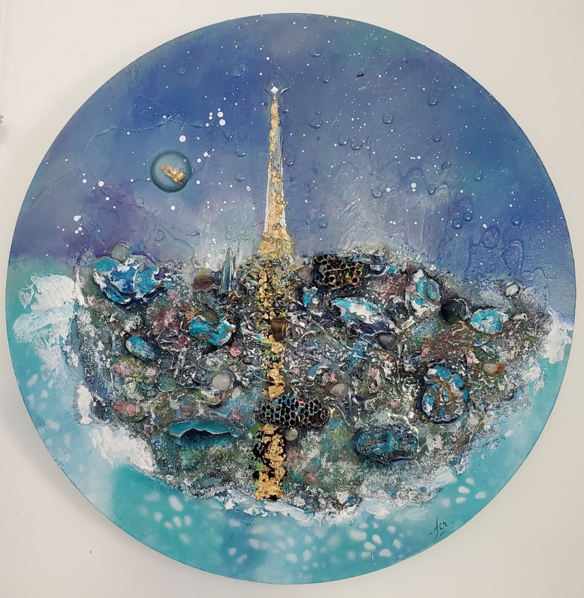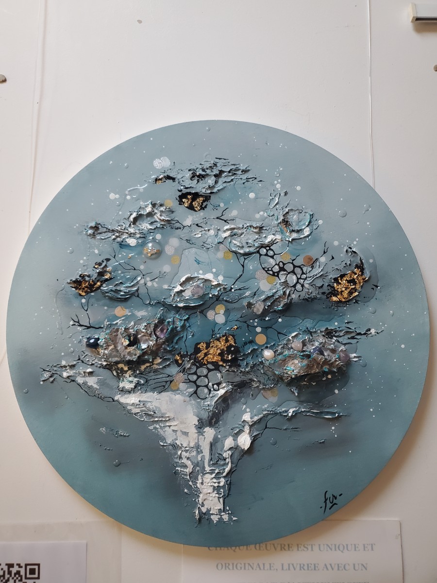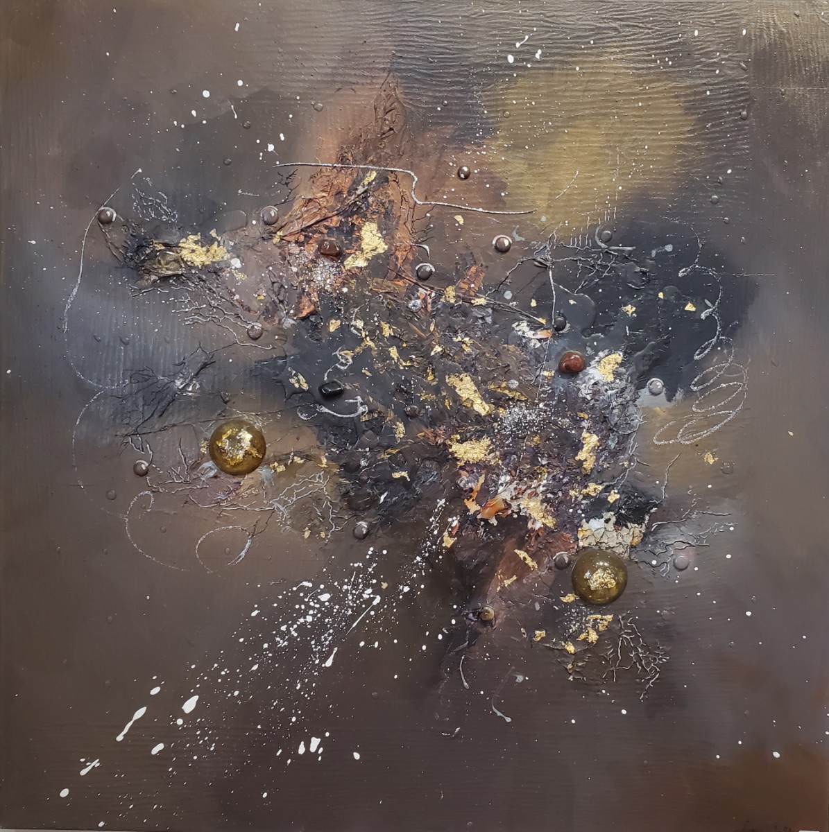 J oscille entre sculpture et peinture, alliant matières, pigments, acrylique, résine, feuilles d'or et minéraux (pierres fines)..c'est un travail de superposition permettant différentes interactions avec la lumière...ce qui a valu de me démarquer et de remporter de nombreux prix dans différents salons d'art..(liste sur demande)..