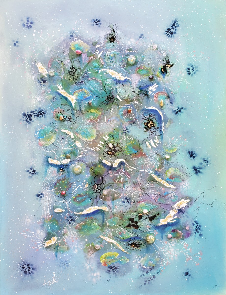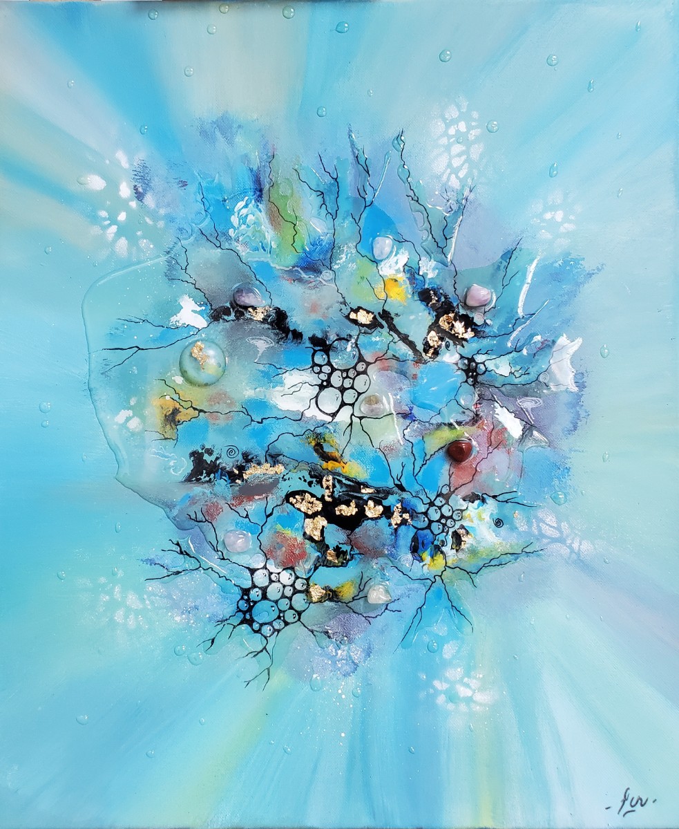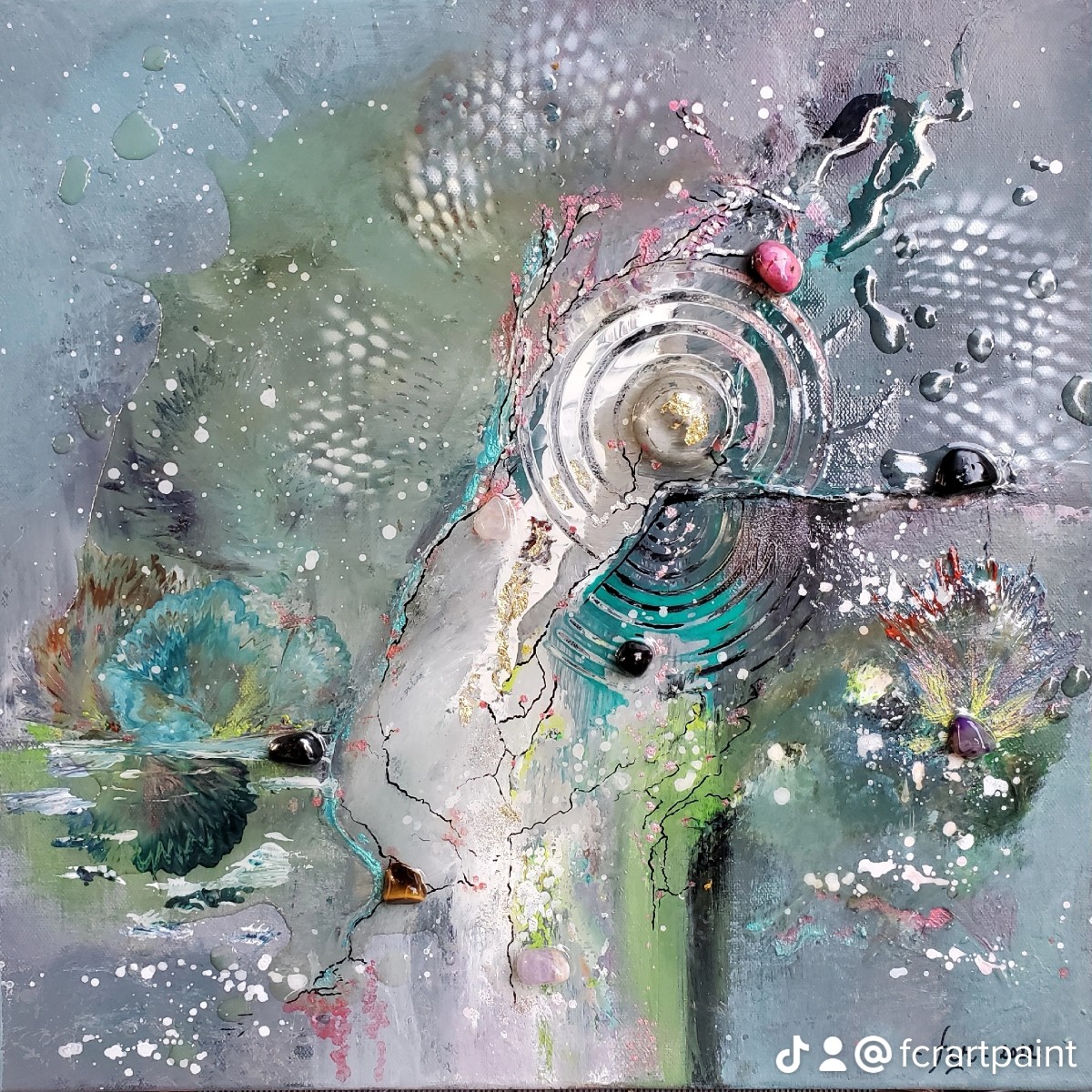 J oscille entre sculpture et peinture, alliant matières, pigments, acrylique, résine, feuilles d'or et minéraux (pierres fines)..c'est un travail de superposition permettant différentes interactions avec la lumière...ce qui a valu de me démarquer et de remporter de nombreux prix dans différents salons d'art..(liste sur demande)..