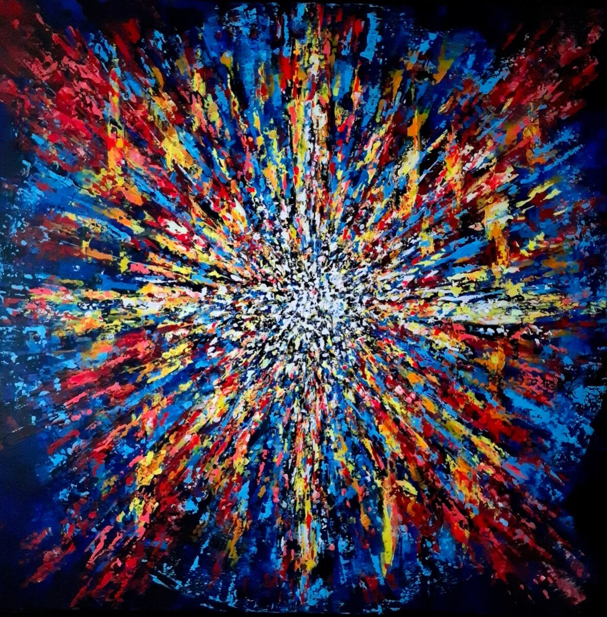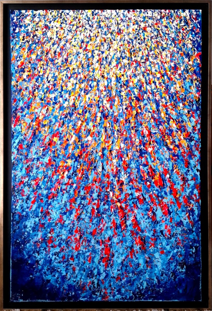 Formée au design automobile, elle développe une peinture instinctive et structurée, traversée par des mouvements organiques et des champs chromatiques intenses qui évoquent les forces de transformation à l’œuvre dans le monde et l’univers.