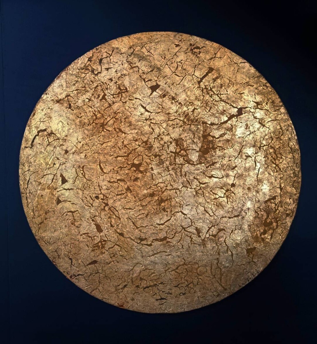 Terre d’or 90cm diam. Liant,pigment,cuivre sur bois 2023