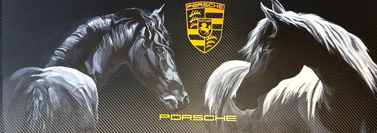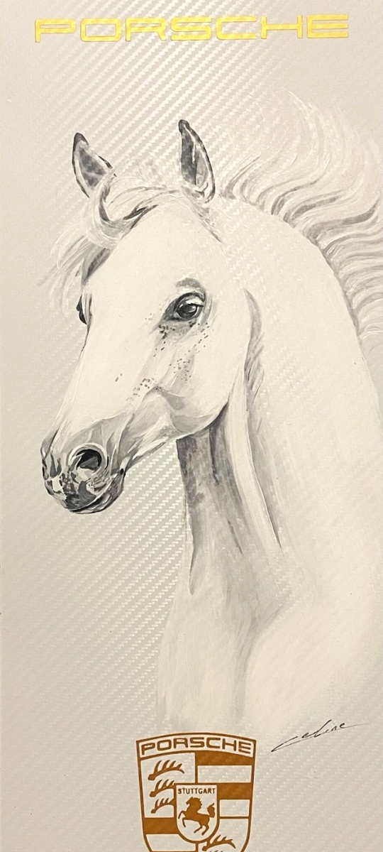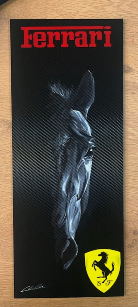 Sur dibond, dans un univers plus masculin, le monde l'automobile, elle va représenter les animaux et y apposé la marque d'une voiture. Par exemple : un cheval et le logo Ferrari.