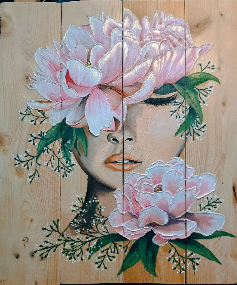 Artiste passionnée, elle crée des tableaux à partir de différents supports : toile, bois de palette et dibond.