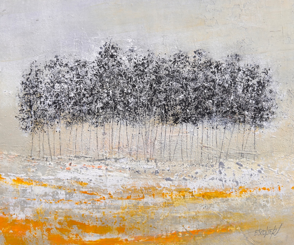 Née en 1960 Odile Escolier, originaire de Nancy, vit en Savoie depuis plus de quarante ans. Après avoir exploré différentes techniques, aquarelle, encres, pastel, elle développe ensuite un langage personnel mêlant acrylique, techniques mixtes et recherche de la matière. Depuis plus de vingt-cinq ans, son travail se distingue par l’intégration de matériaux bruts, sable volcanique, ciment, mortier, pigments, qui confèrent à ses œuvres une présence tactile et poétique singulière.