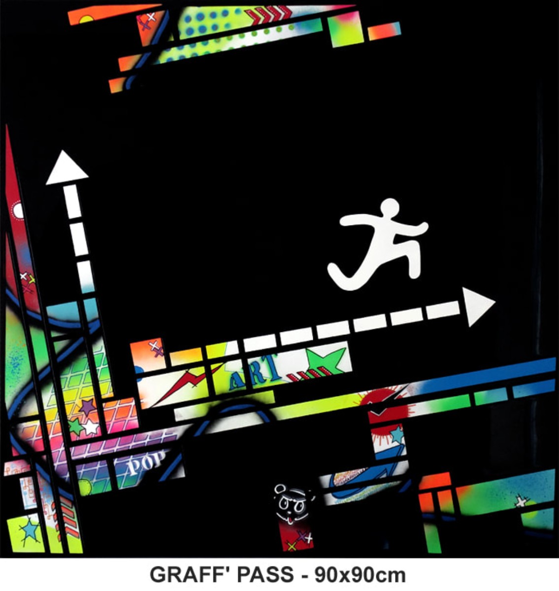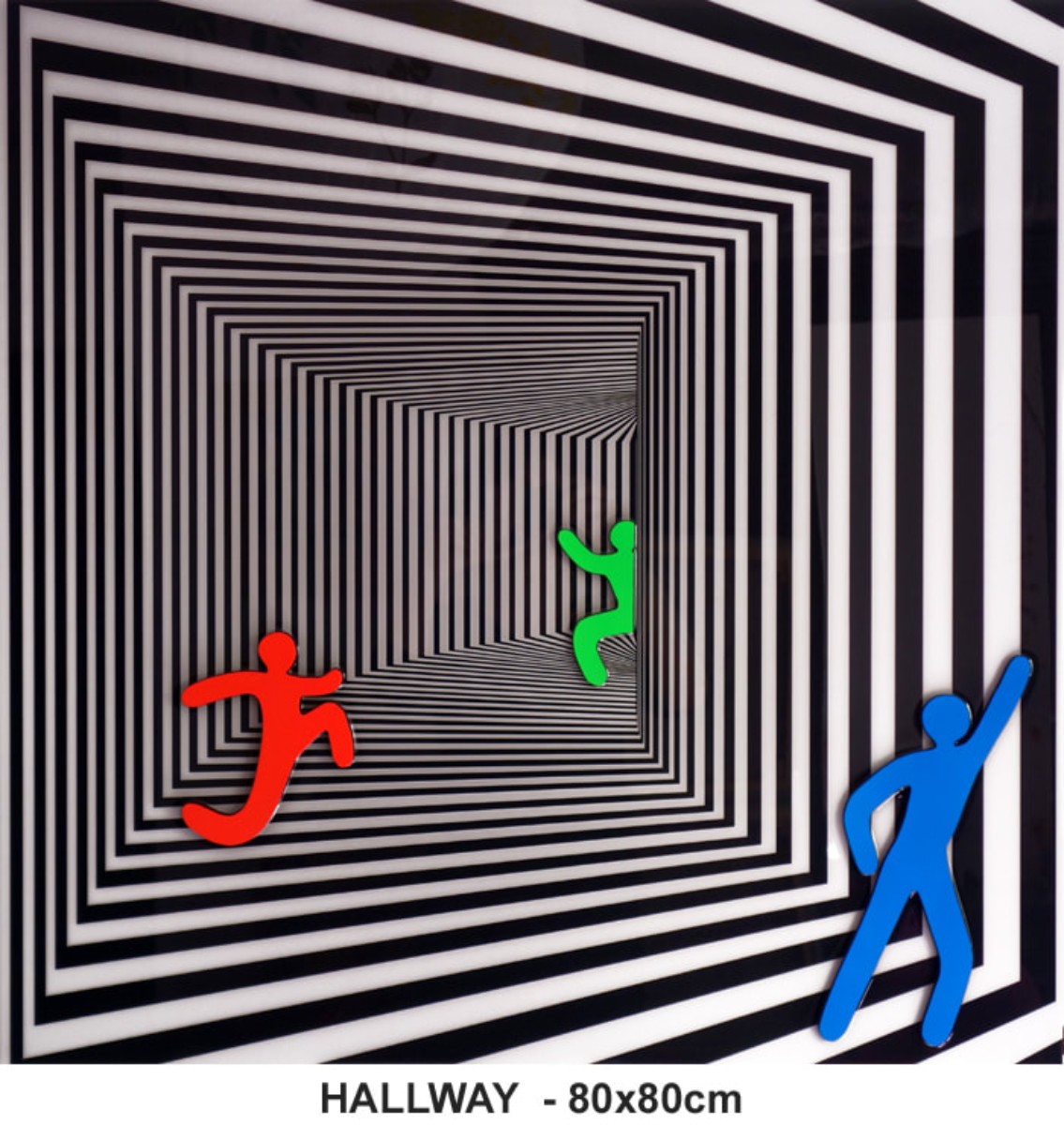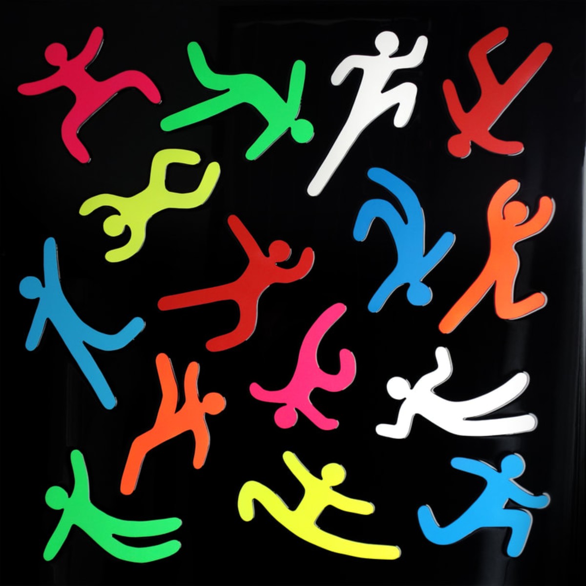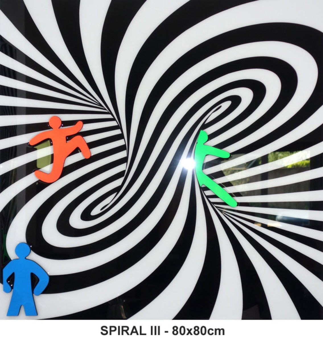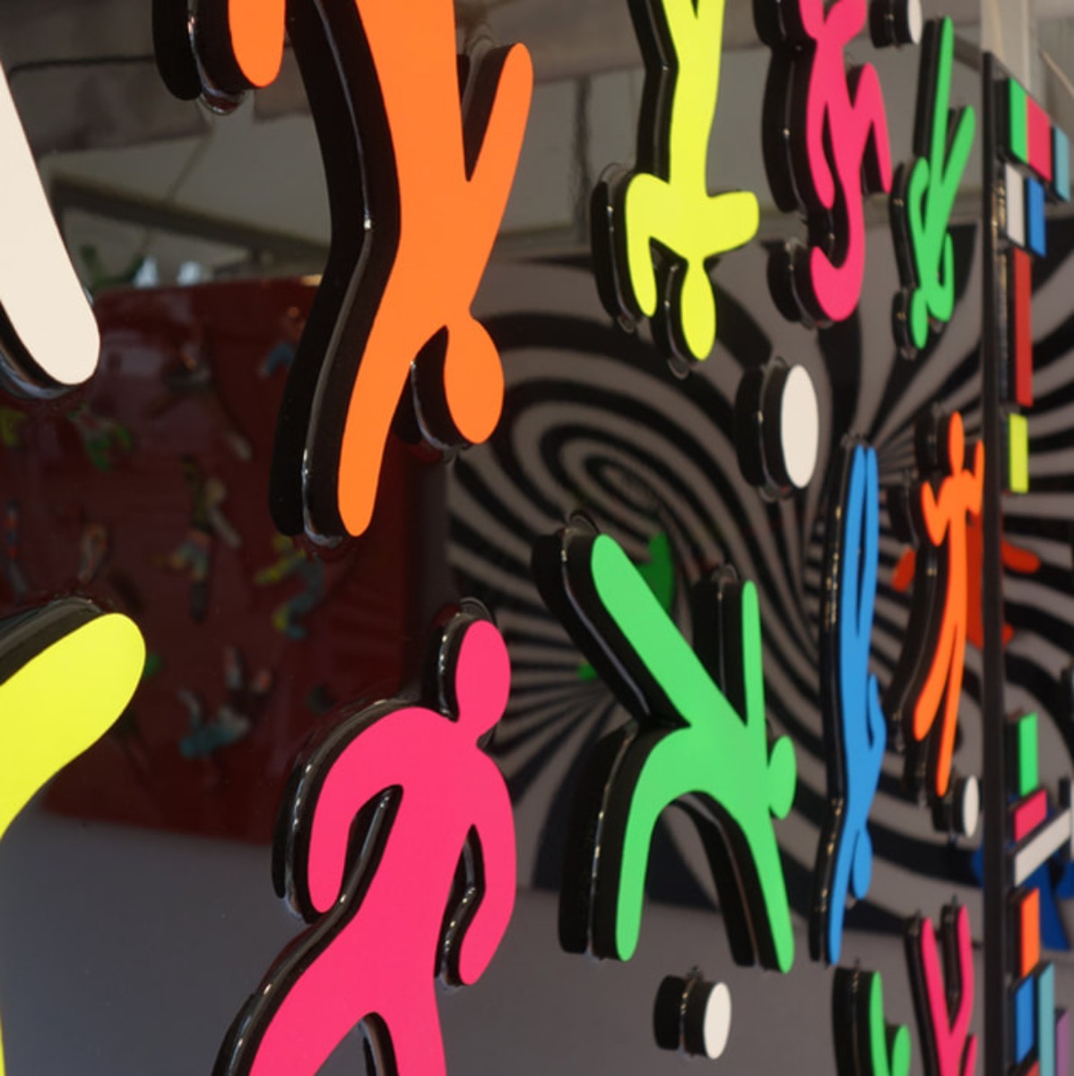 Sa création est axée sur le mouvement, la rythmique. Pour ce faire, elle y oppose des éléments géométriques statiques rappelant nos structures architecturales. Ses « pictos asexués » sont figés dans la résine.