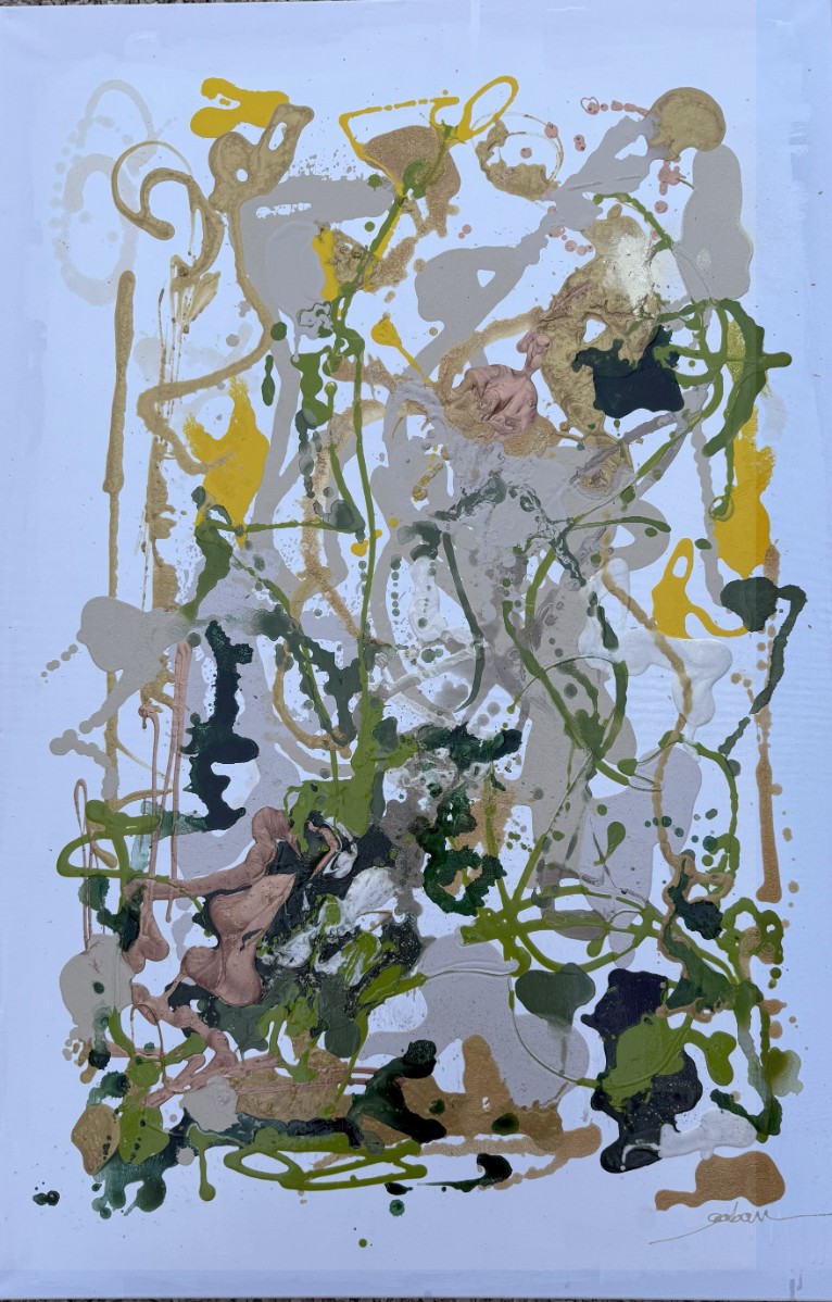 Issu d’une lignée d’artistes – petit-fils de Maxime Pierre André Verdier, peintre et professeur aux Beaux-Arts de Poitiers, et fils de Michel Verdier, médecin pathologiste et laqueur – GABAN porte en lui la mémoire des gestes et la rigueur du regard et la liberté des pigments. Pourtant, c’est en marge des académies qu’il forge son langage : après quelques cours de dessin et de pastel, vite délaissés, il se laisse guider par l’intuition, la matière et le geste. L’acrylique s’impose à lui comme médium privilégié, pour sa capacité à conjuguer fluidité, éclats et épaisseur.