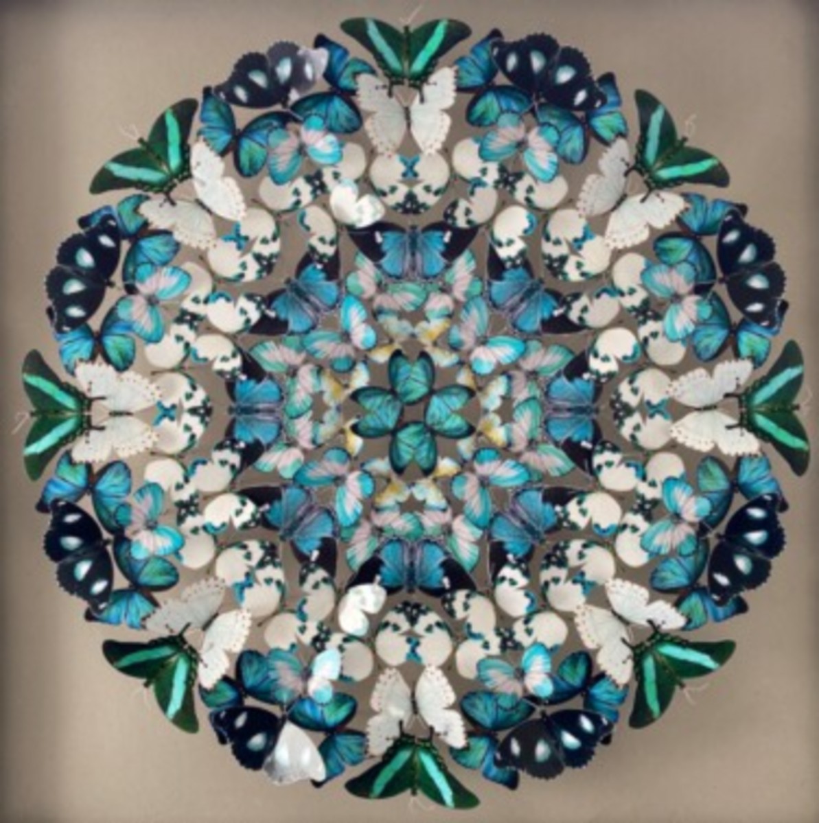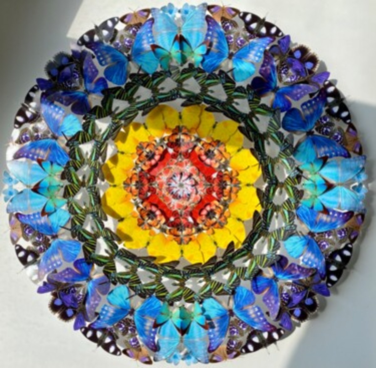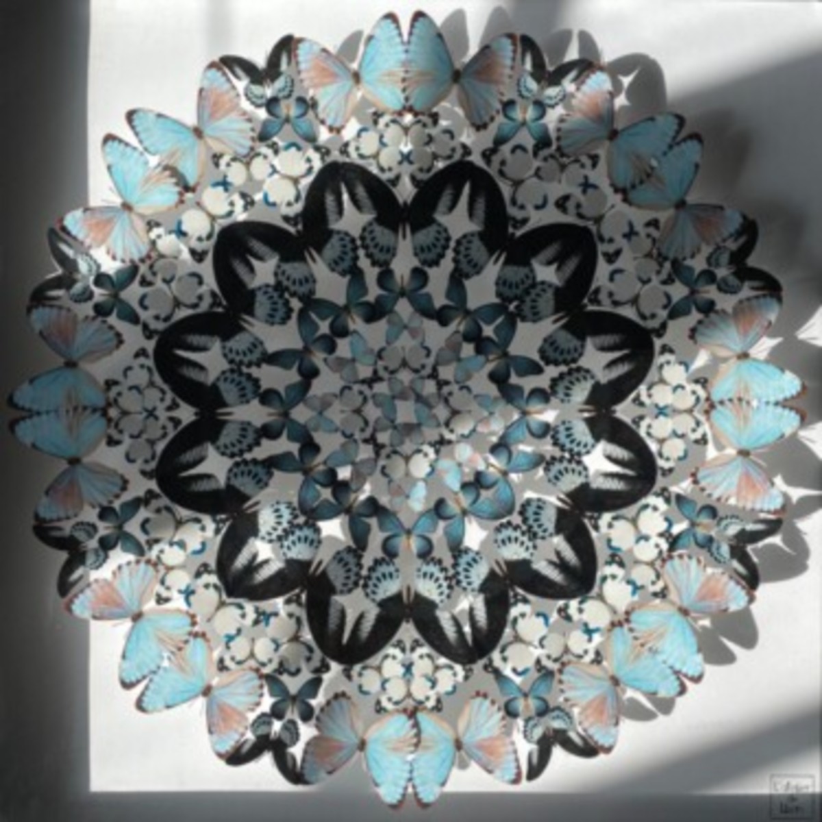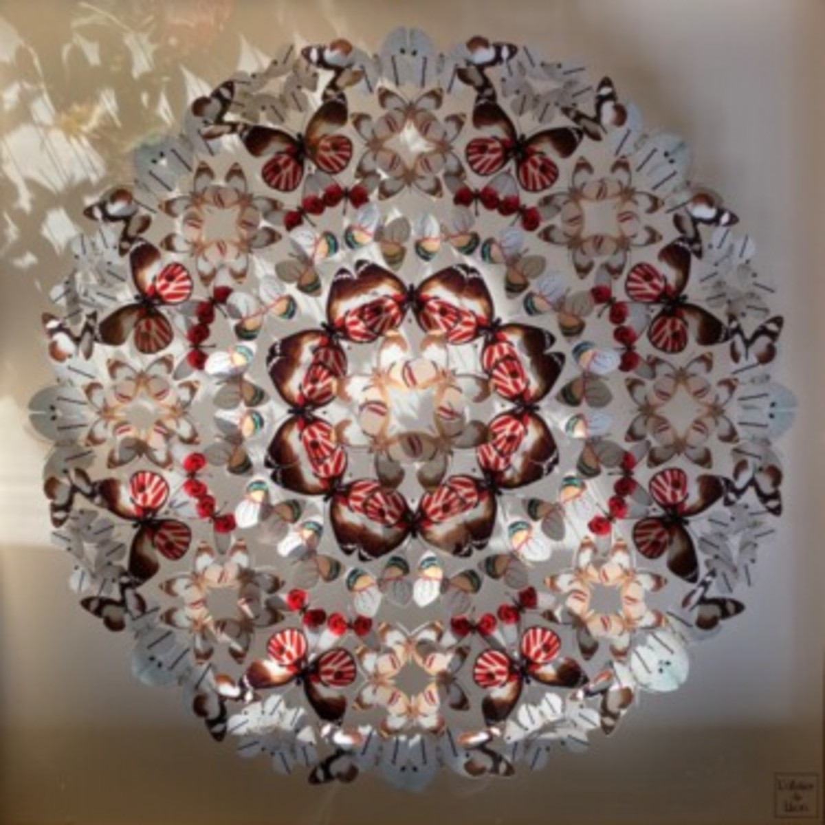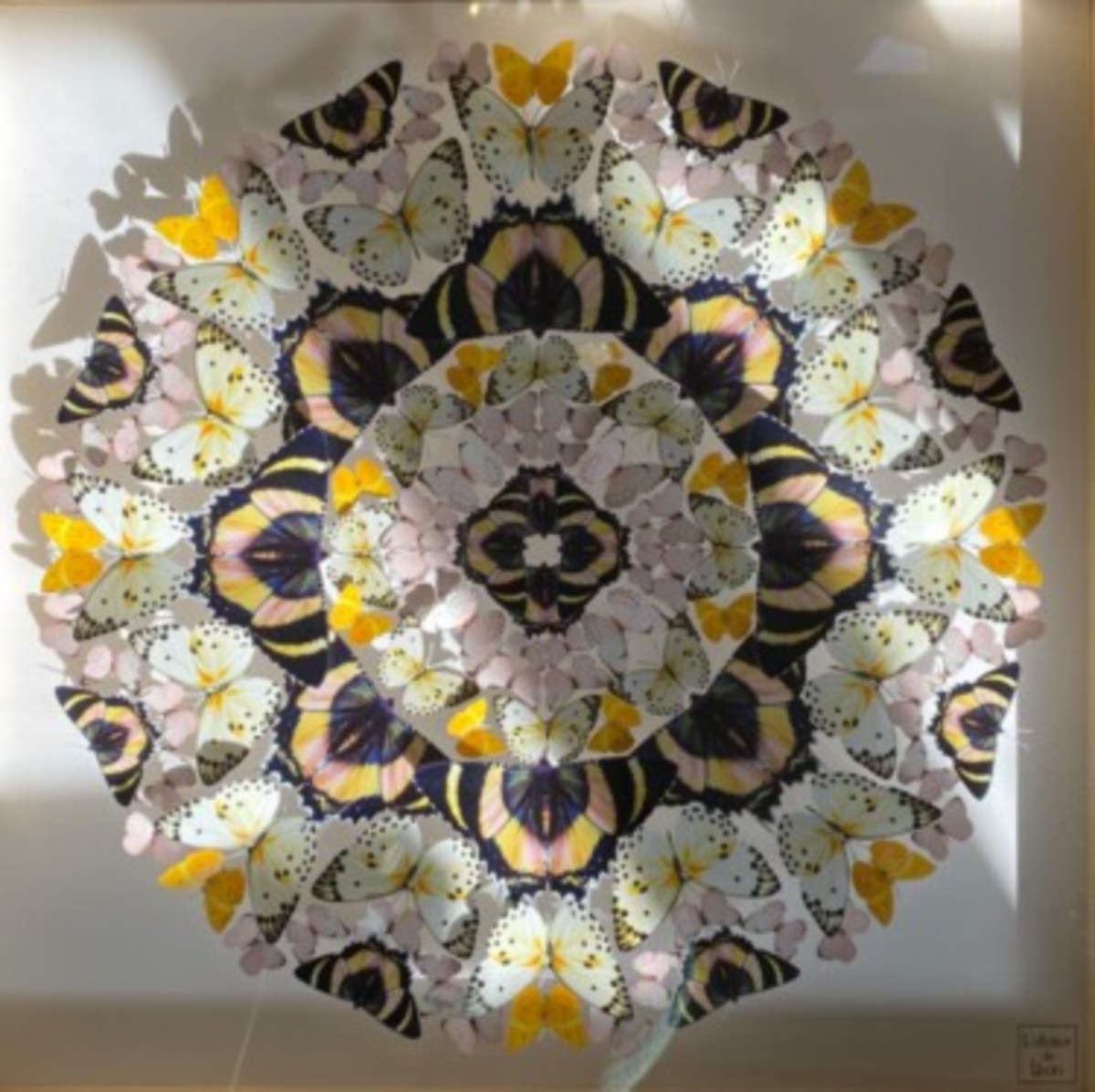 Hors les modes et les tendances, guidée par son besoin impérieux de créer de la beauté et de l’harmonie, Lison compose des œuvres « centrées » autour de ces merveilles de la nature que sont les papillons. Avec sa précision, son habilité manuelle, son sens du graphisme et les ressources du numérique elle redonne un sens véritablement artistique au digital. En multipliant l’unicité de ses modèles elle architecture entre autres des rosaces uniques qui redonne du temps et du relief à l’éphémère. Sa marqueterie entomologique hypnotise curieusement notre oeil pour nous offrir une possibilité de recueillement spirituel comme le faisait certainement les vitraux en rosace de nos cathédrales.