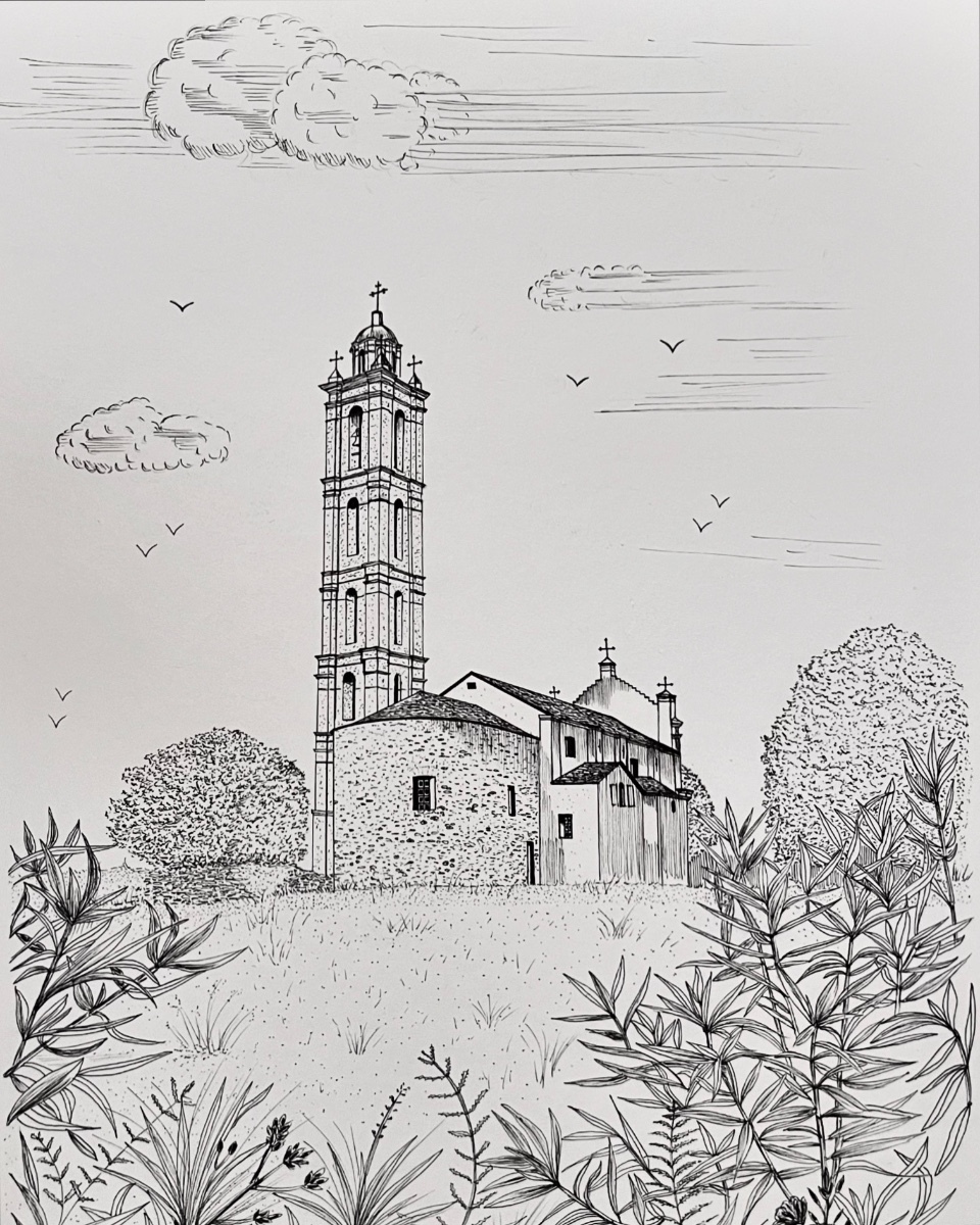 En utilisant des techniques variées telles que l'encre de Chine, le crayon, le stylo à encre ou l'aquarelle.