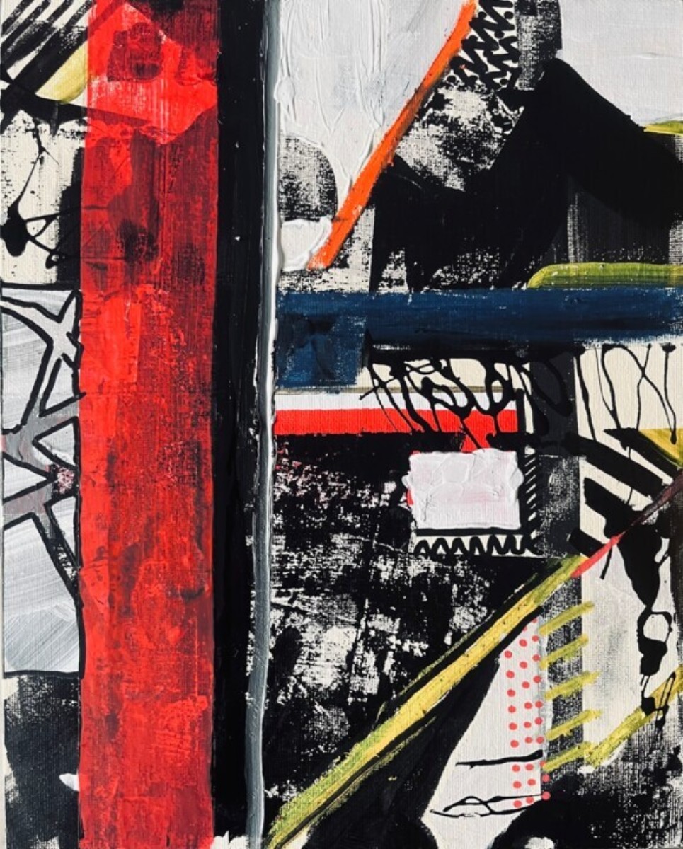 Par ailleurs, il réalise des peintures abstraites utilisant des matériaux variés comme l'acrylique, le pastel, le marqueur et le ruban adhésif sur différents supports tels que le carton ou le MDF. Son approche privilégie un geste direct et affirmé, où la ligne et la couleur portent l'expression.
