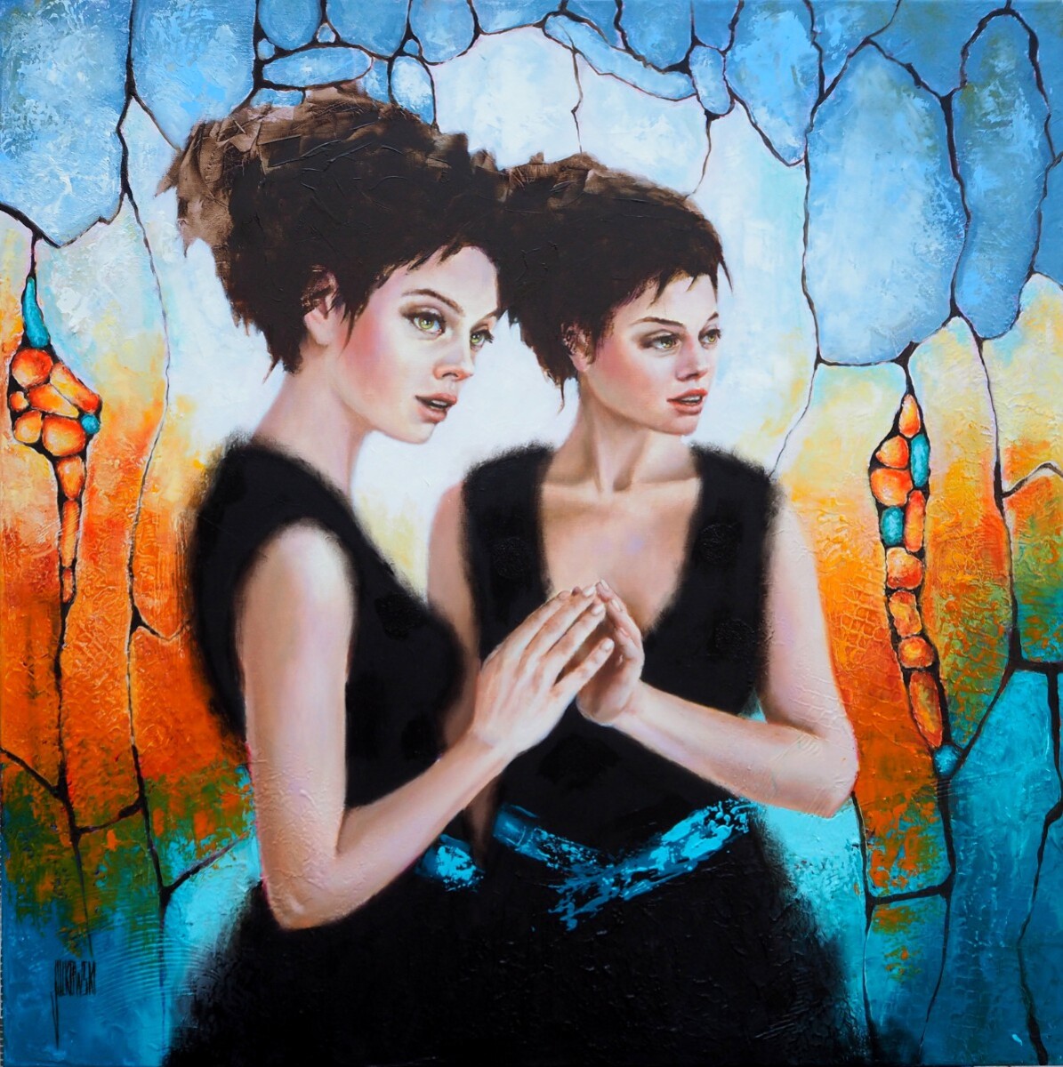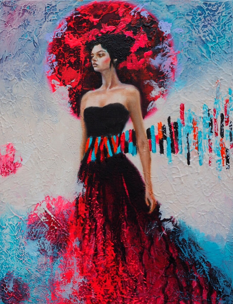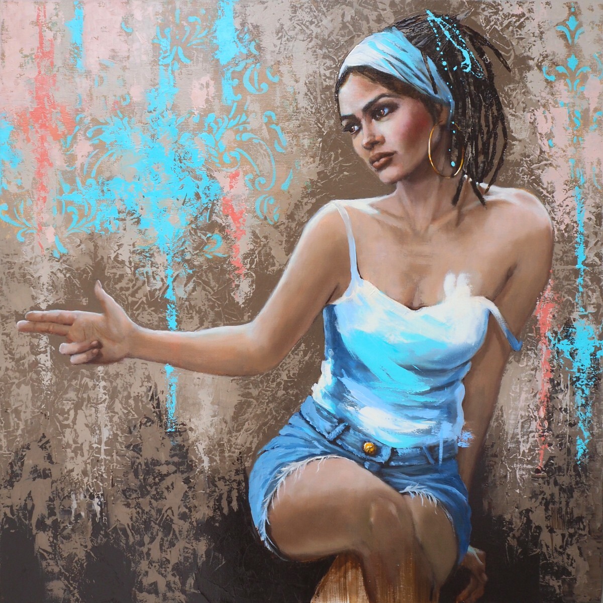 « LES PORTRAITS » : depuis plus 2021 environ, elle cible son travail sur ce qui l'a toujours passionnée, l'être humain. Elle peint notamment des portraits où elle se focalise sur l'expression des personnes et laisse libre cours à sa créativité en imaginant les vêtements, les coiffures, accessoires, etc...Elle utilise toutes sortes d'outils pour traduire ce qu'elle ressent. De même elle utilise indifféremment de la peinture à l'huile épaisse ou extrêmement diluée. L'oeuvre est ébauchée aux endroits périphériques tandis que l'expression du modèle ou le point focal est traité de manière plus précise et soignée.