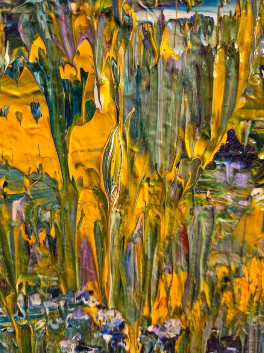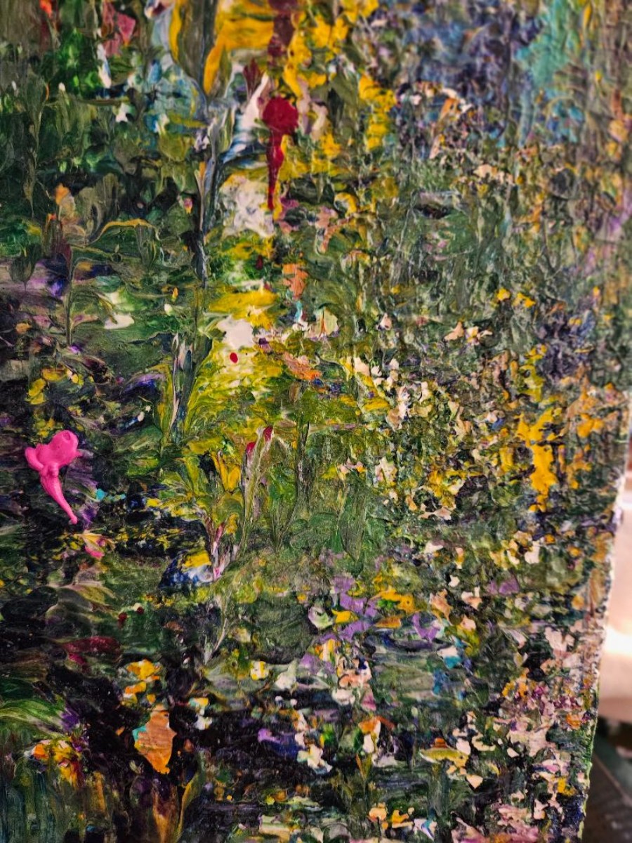 J'ai rapidement mis de côté mon pinceau, car je trouvais frustrant de ne pas sentir la peinture et la toile sous mon toucher. J'ai expérimenté différentes techniques et je ne peins maintenant qu'avec mes mains, mes doigts et mes ongles, en travaillant avec de la peinture acrylique.