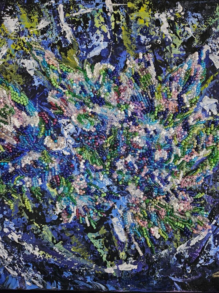 Le plaisir de broder me manquant, j'ai décidé de coudre de minuscules perles en verre et en cristal sur la toile de lin. J'ai commencé par coudre quelques dizaines de perles et aujourd'hui, j’ai des tableaux qui en contiennent des milliers (le plus grand en ayant plus de 35 000). Les perles sont en majorité cousues une à une, afin de produire l'effet visuel recherché et un travail minutieux de qualité. J’ai décidé avec cette technique de réaliser une collection de toiles tactiles spécifiques aux personnes déficientes visuelles abstraites ou figuratives.