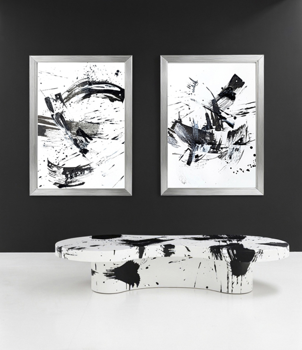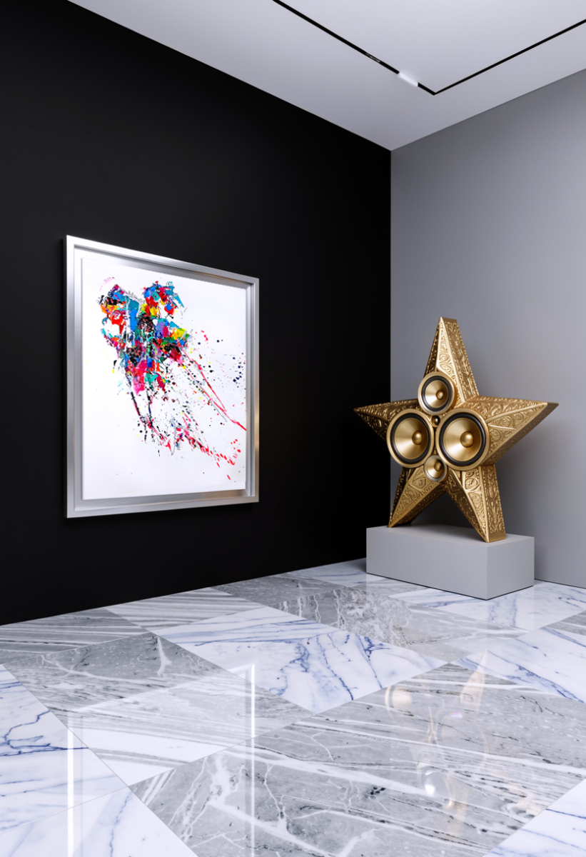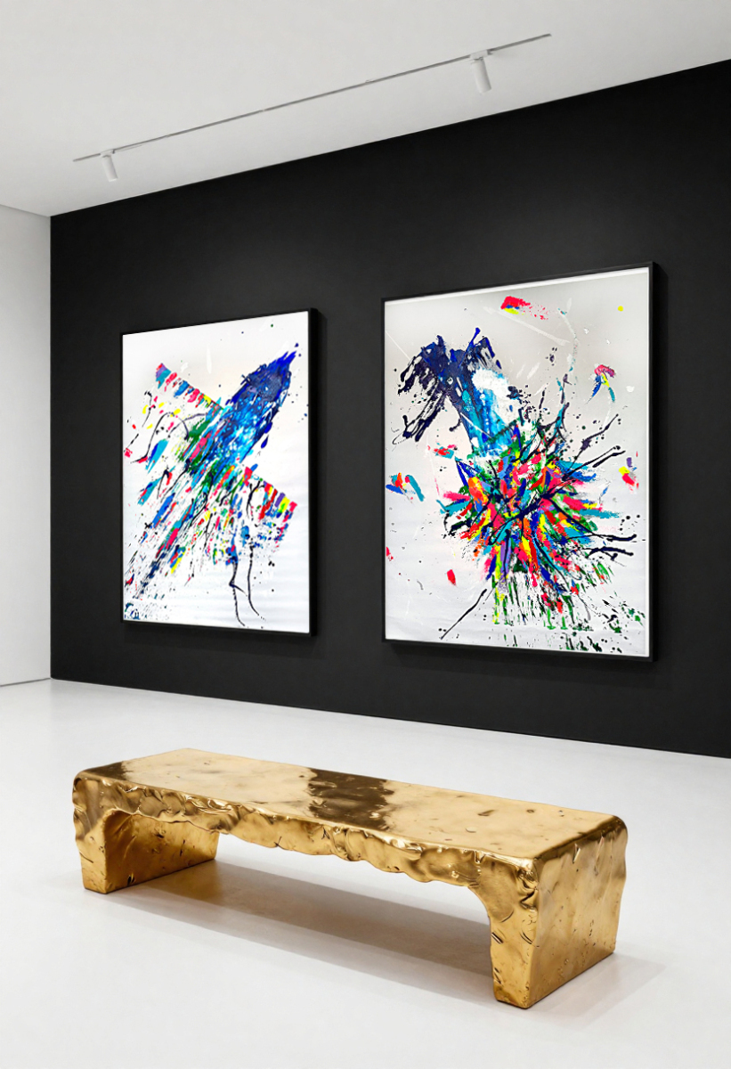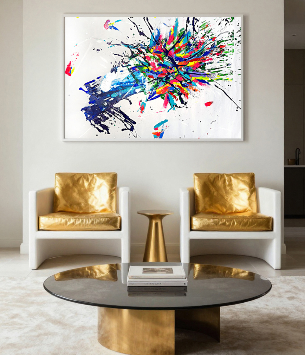 La musique joue un rôle central dans son travail, guidant l’émotion, le rythme et l’énergie de chaque création. Chaque peinture commence par le choix d’un morceau qui correspond à son humeur et à sa fréquence. Le rythme oriente le mouvement du pinceau, le développement des textures et l’émergence des couleurs—transformant vibration, émotion et son en forme visuelle.