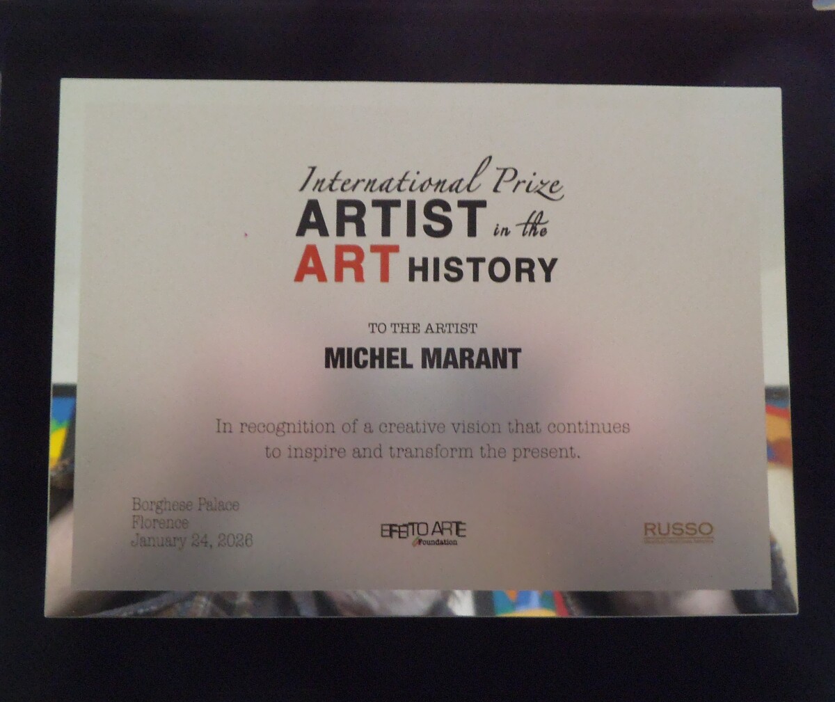 Sélectionné à la haute reconnaissance de la biennale d'art "MAGNA GRECIA PORTA D'ORIENTE" l'Académie ITALIA IN ARTE NEL MONDO m'a décerné, pour l'ensemble de mon oeuvre, le prix "POSEIDON" remis au thèatre "POLITEAMA GRECO" de LECCE Italie.