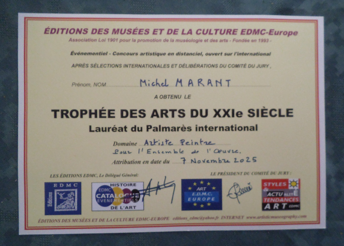 EDMC EUROPE "TALENT DES ARTS D'AUJOURD'HUI" m'a décerné la récompense Artiste d'Excellence 2023