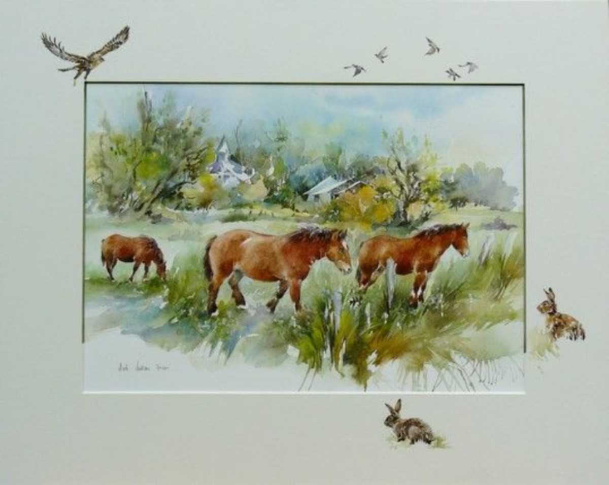 Dans les années 1990, le littoral atlantique m'a invitée à l'aquarelle. Cette technique m'a d'abord aidée à approcher le thème des marines avec légèreté et luminosité. Par la suite, elle est devenue mon principal mode d'expression. Légère et vaporeuse pour les compositions florales, je l'ai travaillée de façon plus illustrative et plus contrastée pour décrire le monde qui m'entoure.