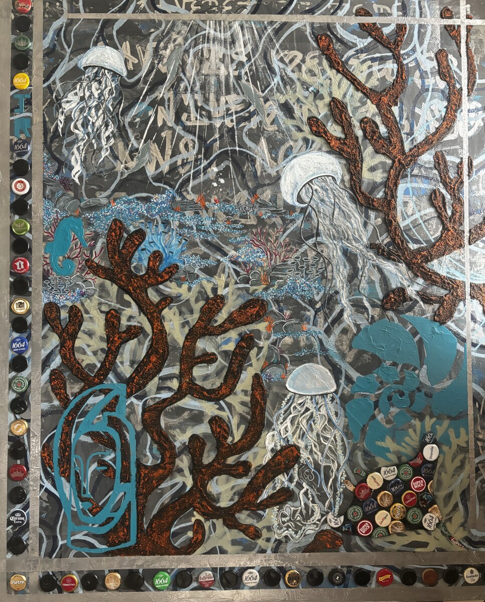 Sa signature artistique : l’utilisation de capsules de bière recyclées, transformées.