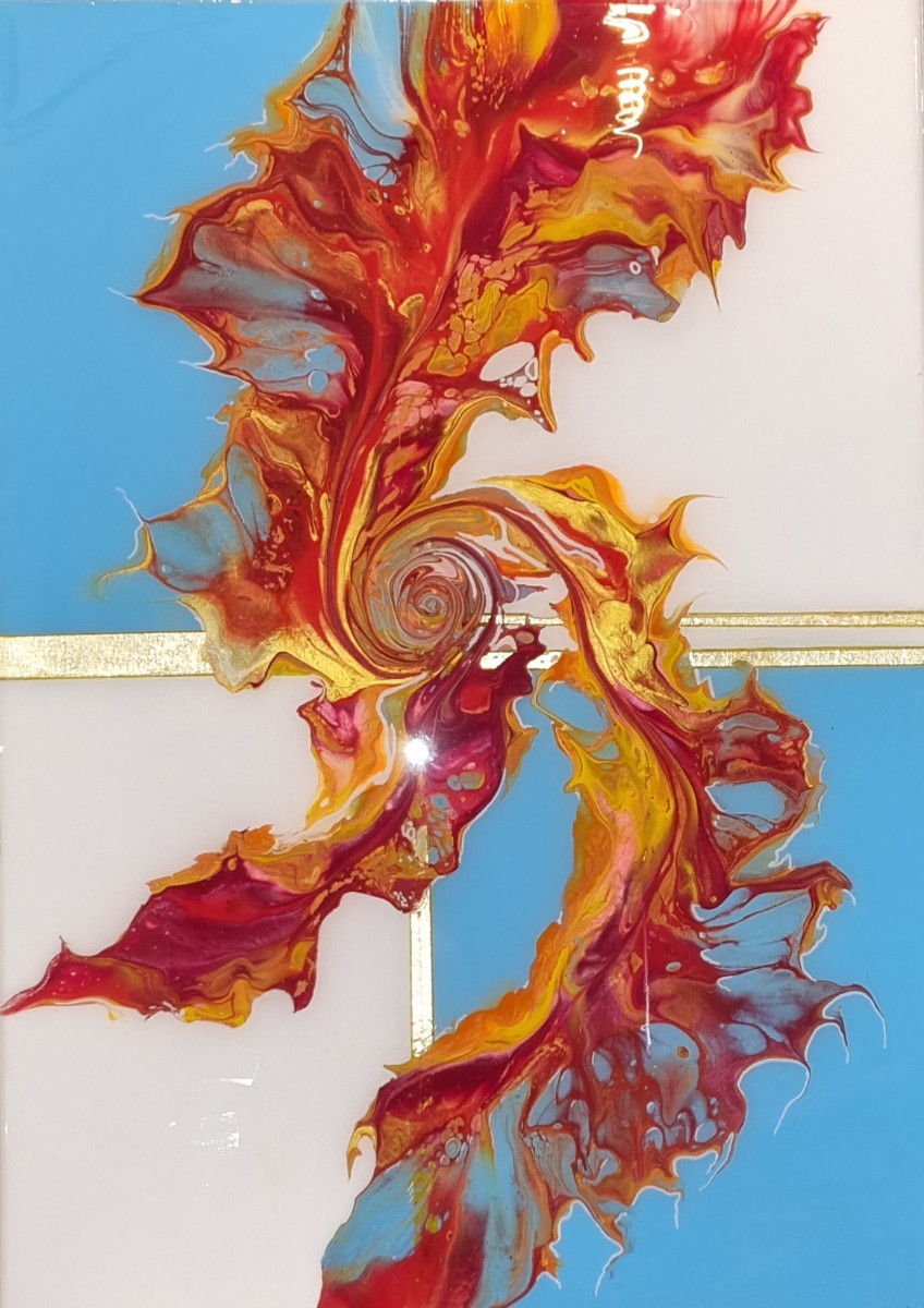 Au détour d'une exposition, il y a 3 ans maintenant, je pus faire connaissance avec le fluid art. Pas besoin de réviser ses cours de dessin pour s'exprimer ! Seuls, l'intention, l'émotion, l'humeur sont aux commandes, jouant avec les couleurs, les contrastes et les mouvements. Quelle révélation pour moi. Gourmande de nouvelles sensations et découvertes, les cours en lignes, les groupes d'échanges sur les réseaux sociaux, m'ont permises de mieux maîtriser cette techniques de coulée acrylique, une nouvelle forme d'expression pour moi.
