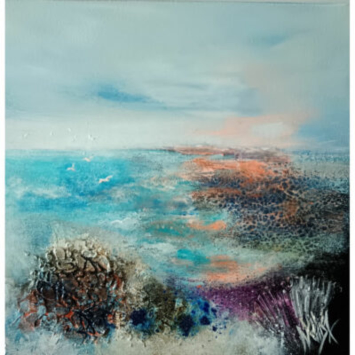 et compose ses toiles au rythme de la musique. Un jeu de couleurs, de matières et de transparences qu’elle crée au fil de l’inspiration. Elle travaille sur l’instant, un trait en apporte un autre, un acte créatif, imaginaire à la gestuelle réfléchie.
