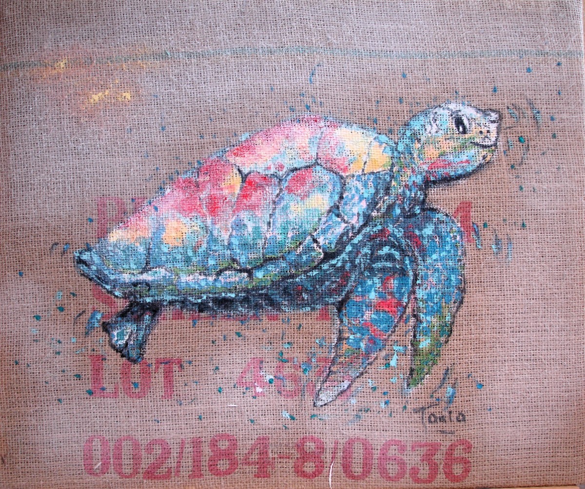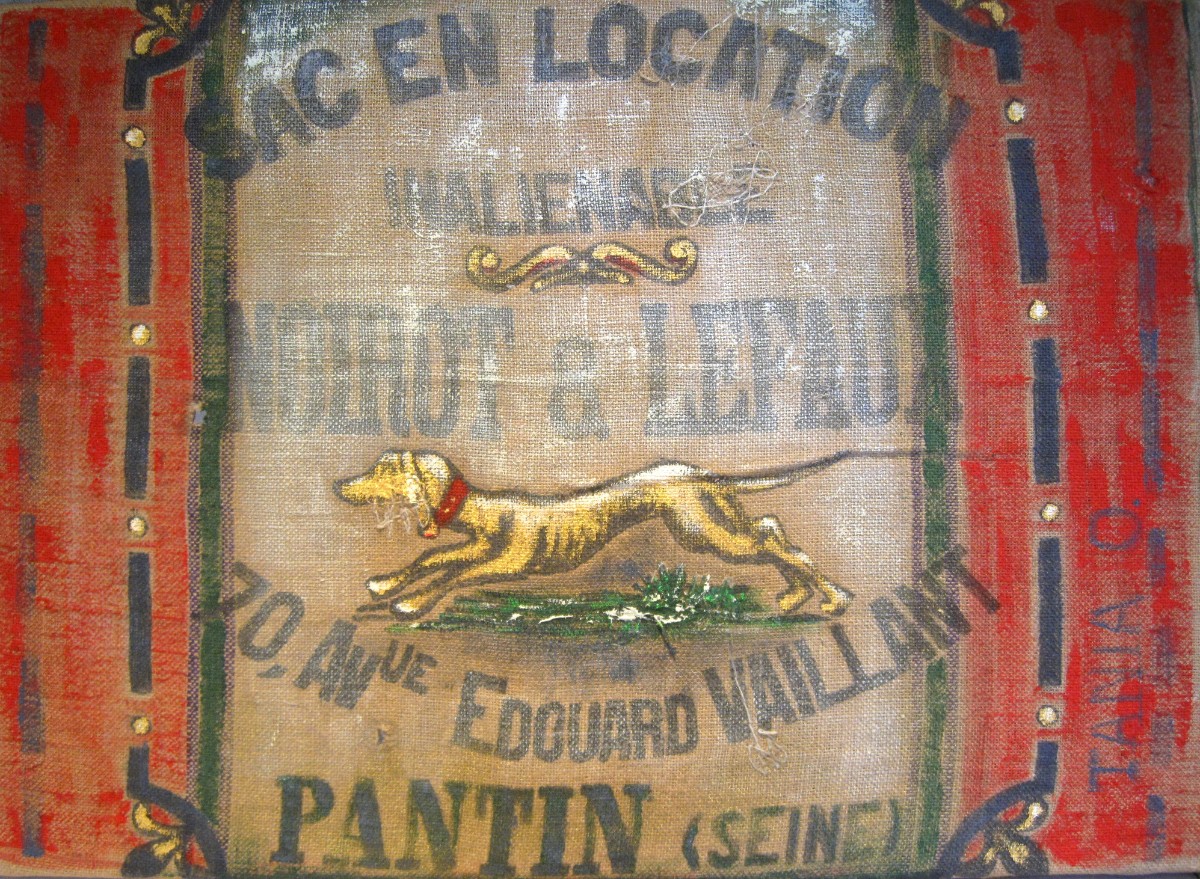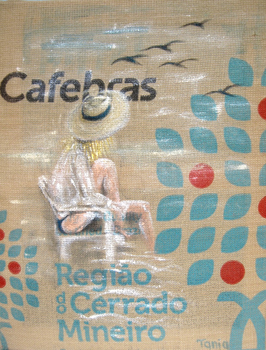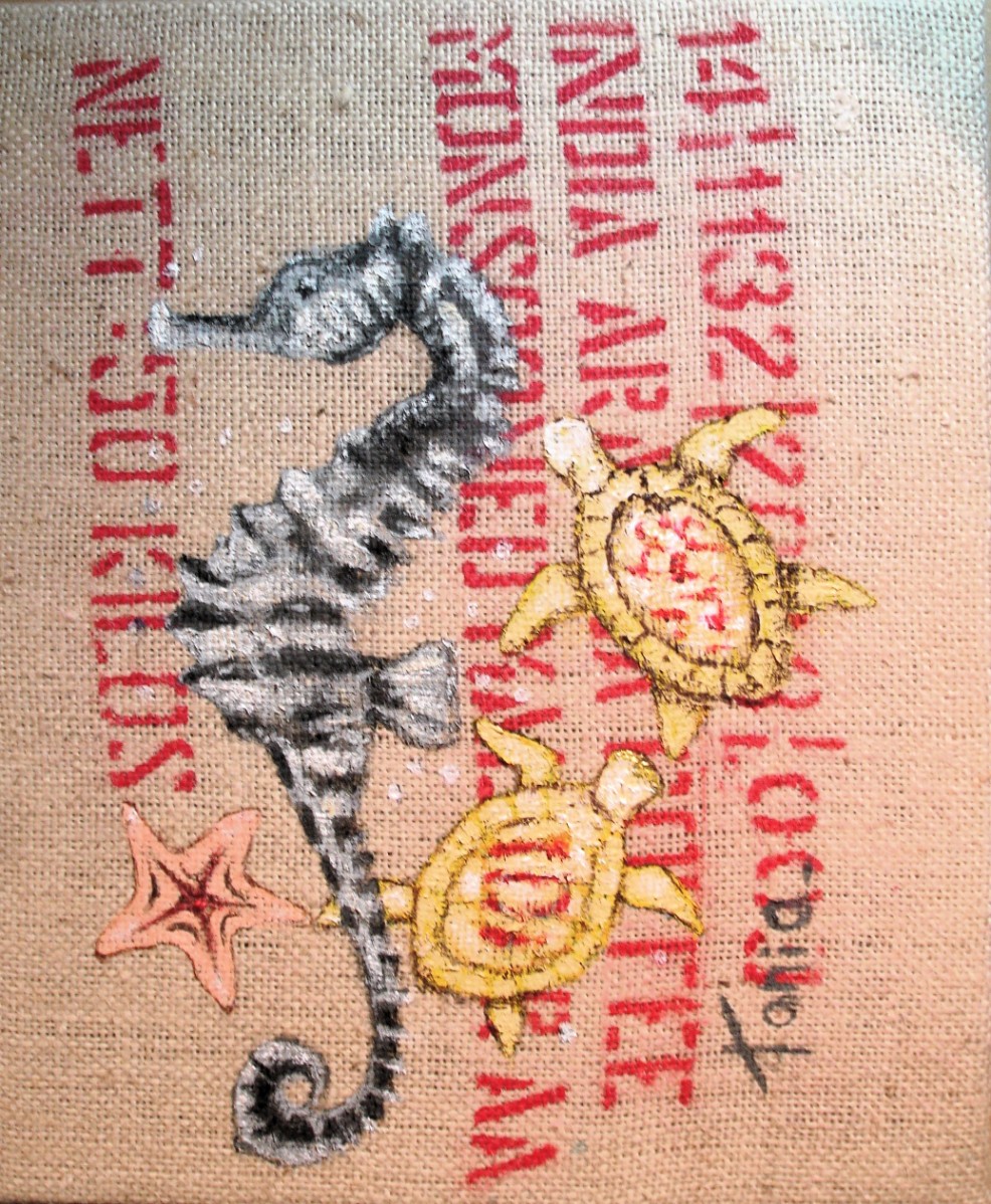 Ainsi donc, je fabrique les supports que je peins ensuite, et j'entre dans le monde du recyclage "upcycling" artistique, que je nomme parfois le "coffee-bag art".