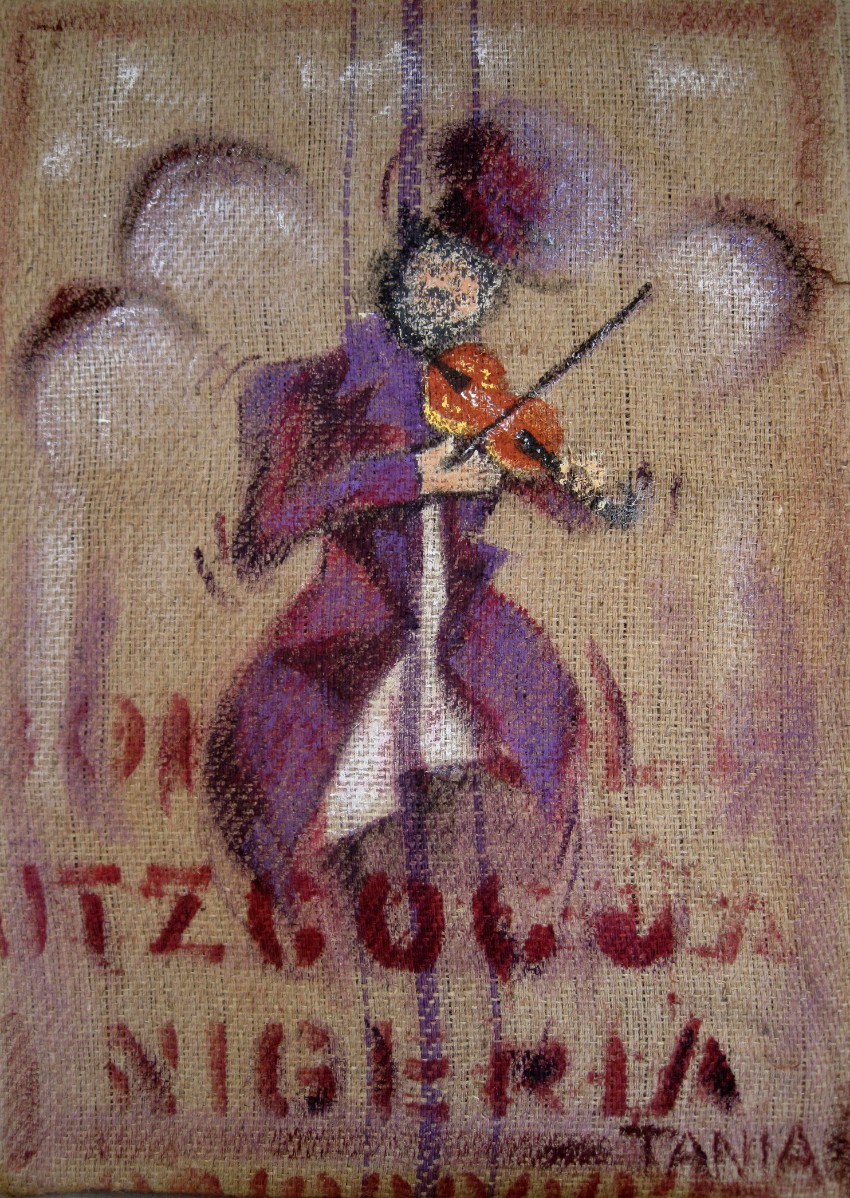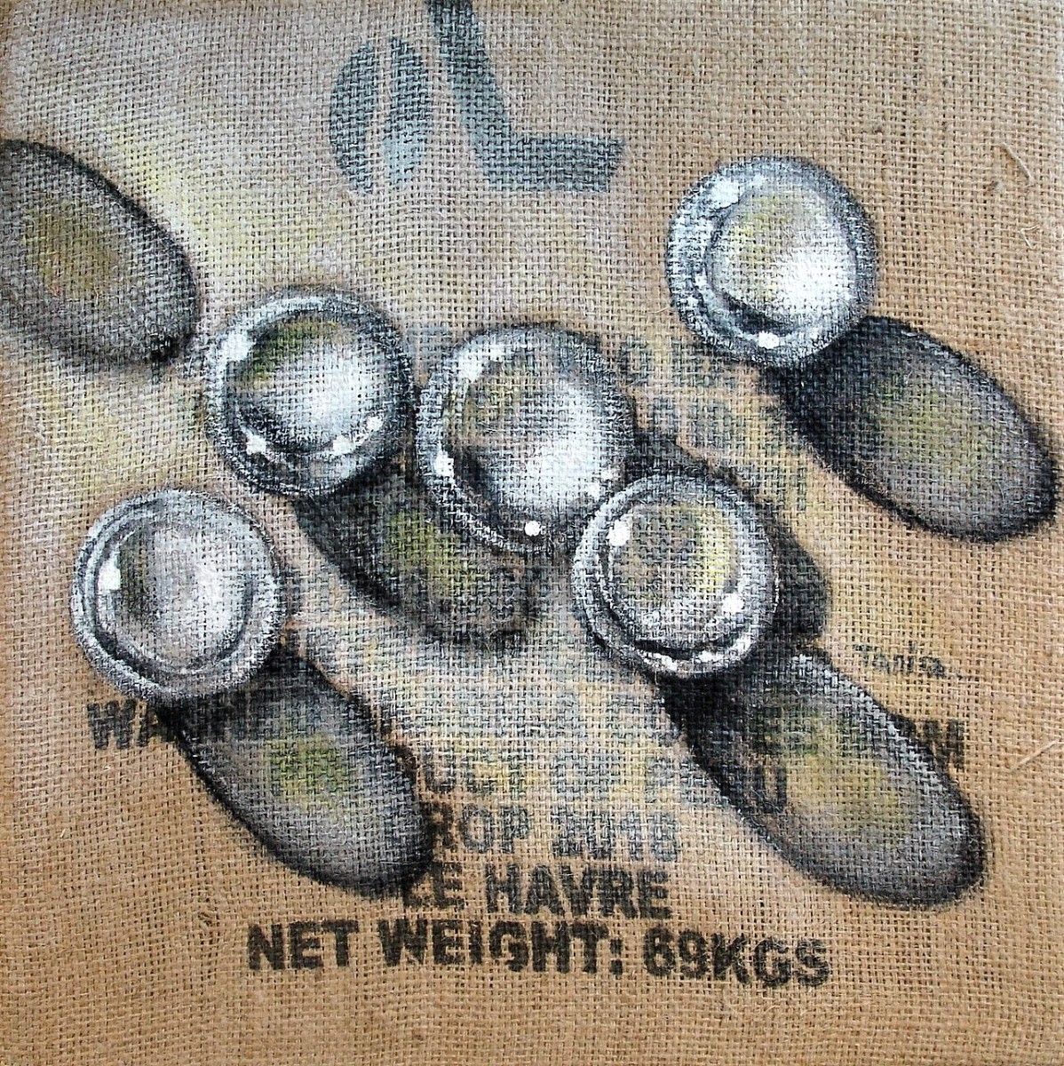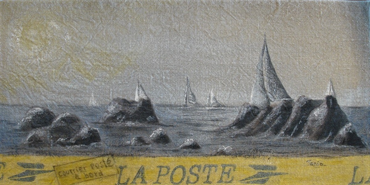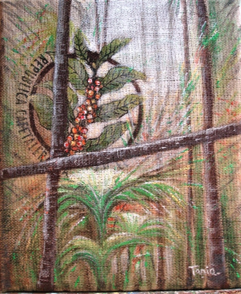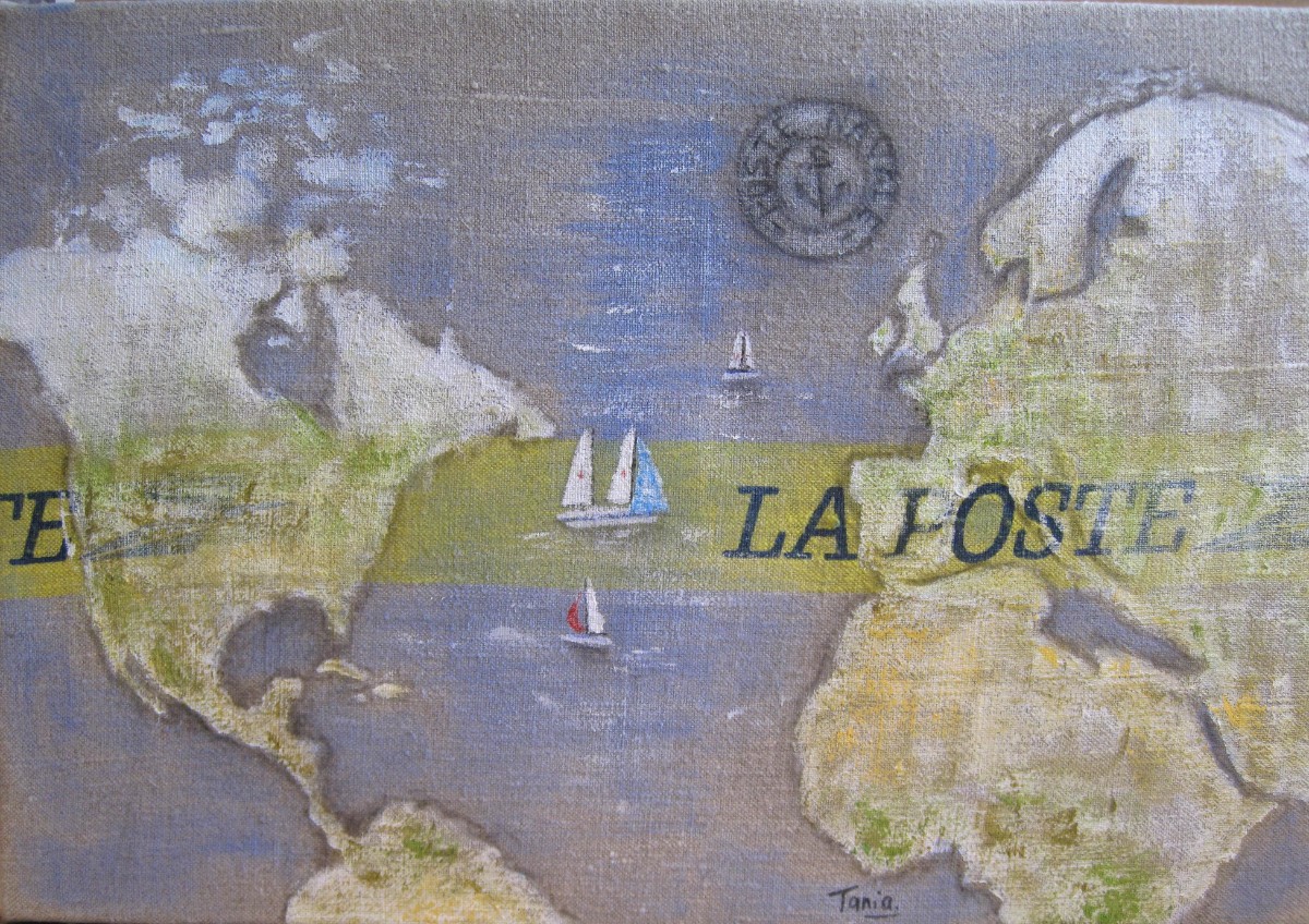 Ainsi donc, je fabrique les supports que je peins ensuite, et j'entre dans le monde du recyclage "upcycling" artistique, que je nomme parfois le "coffee-bag art".
