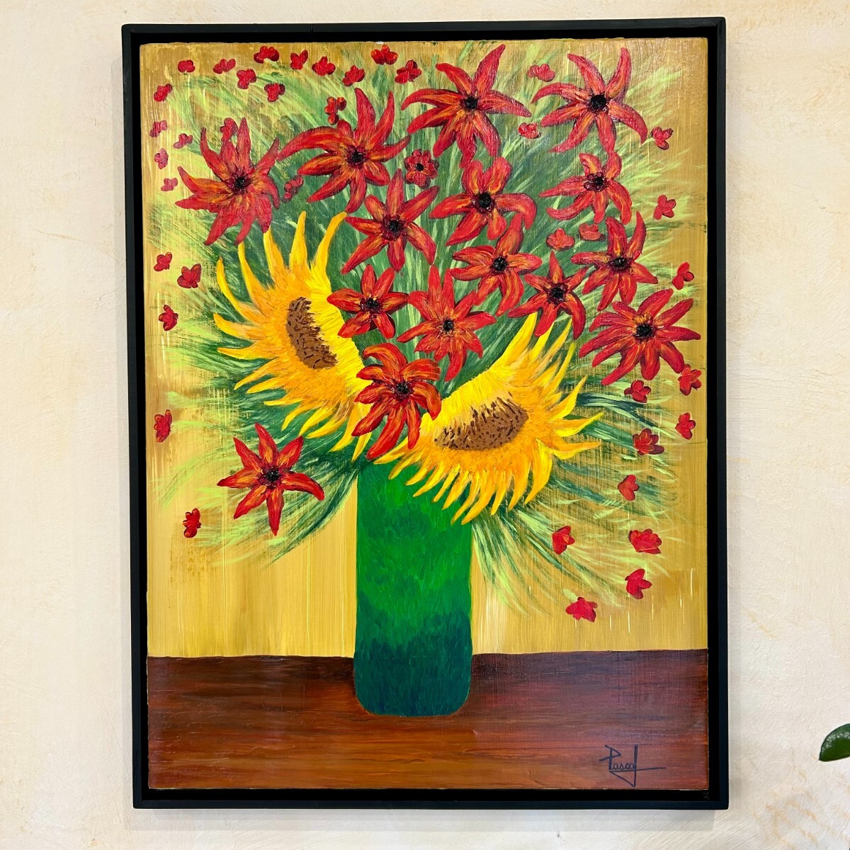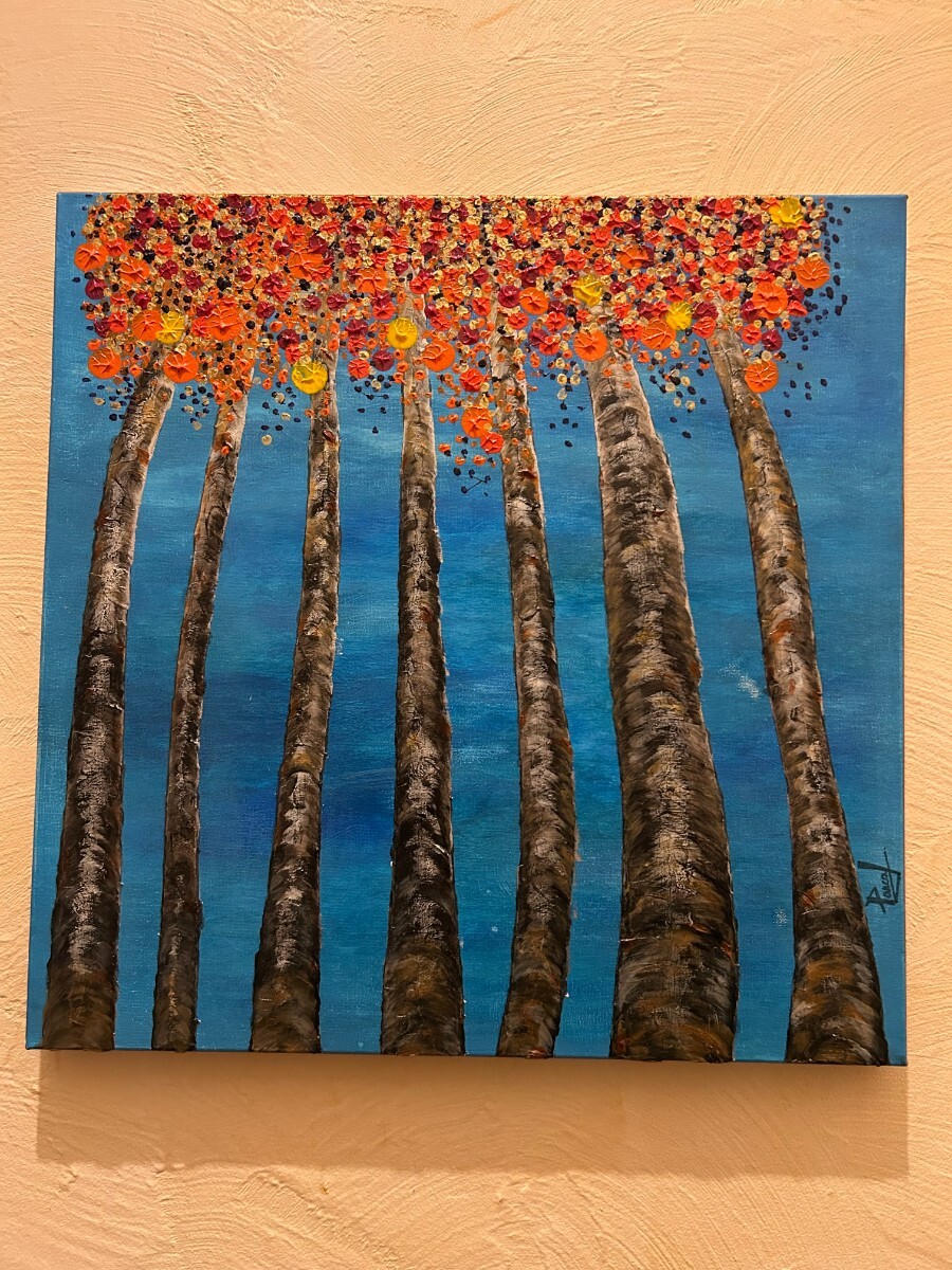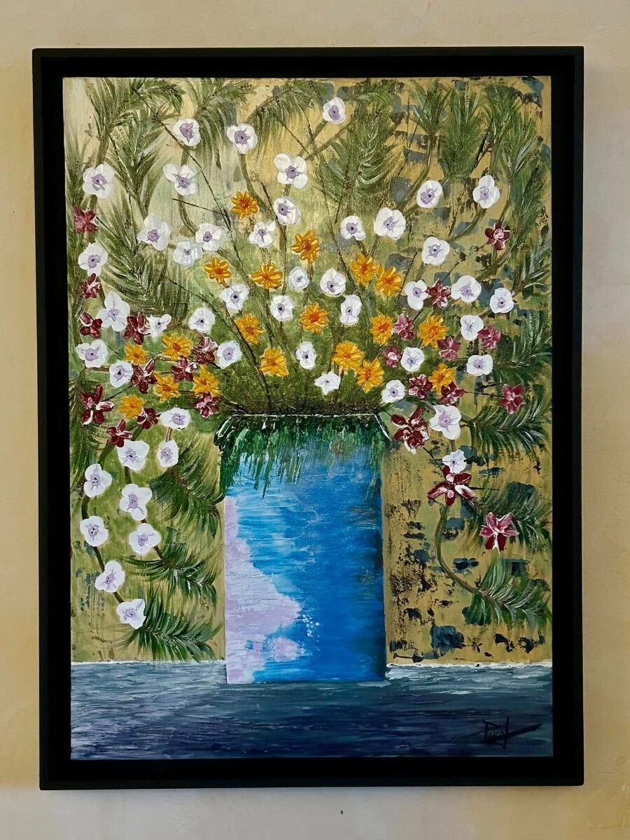Ma peinture utilise surtout des couleurs chaudes comme les ocres, les terres, les rouges profonds et les touches d’or, équilibrées par des verts doux et des noirs intenses. Pour moi, la couleur est une énergie : elle sert à transmettre des émotions et à guider le regard du spectateur dans la toile.