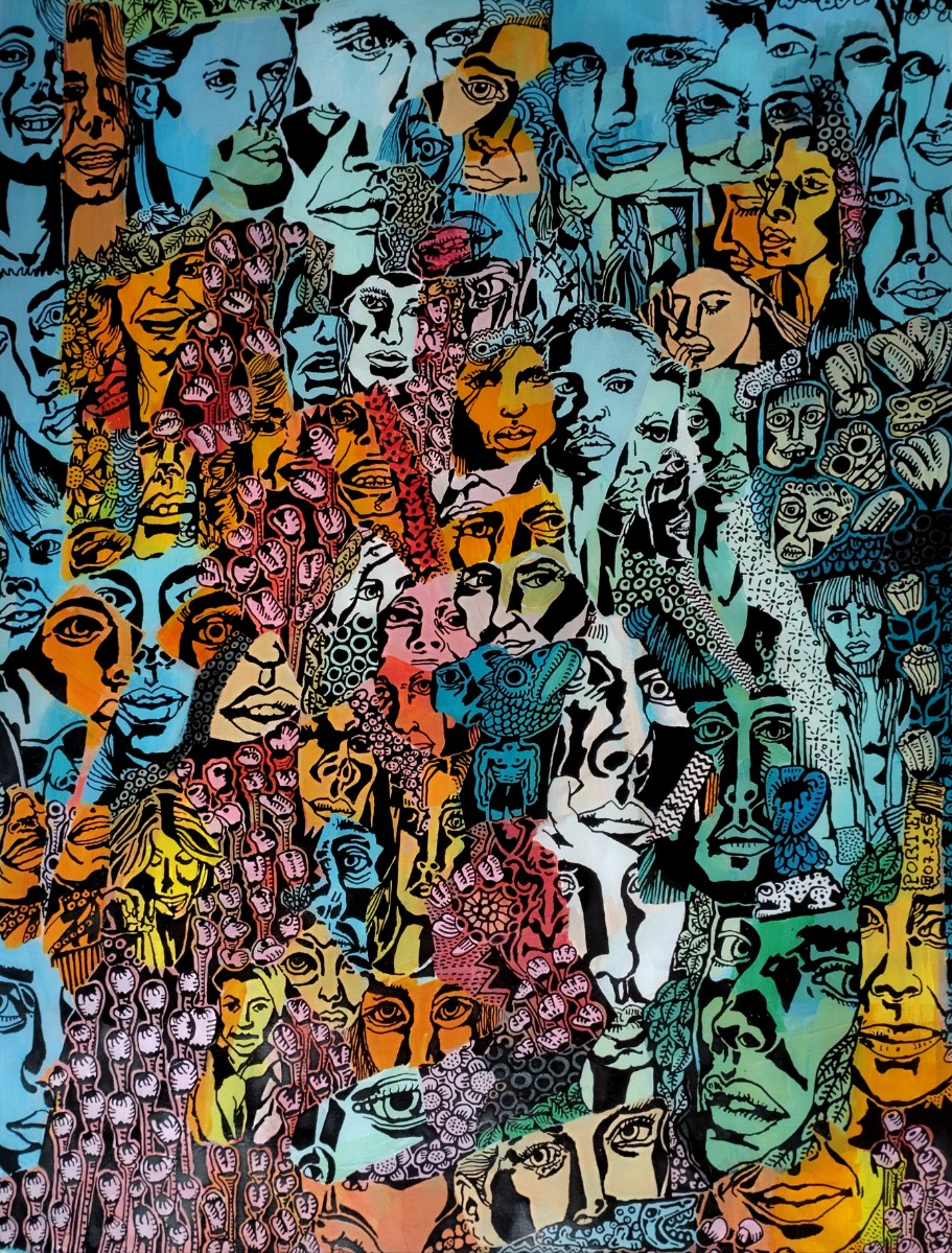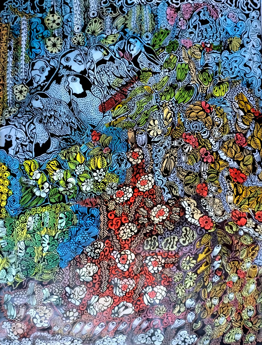 Chaque composition est un palimpseste où le figuratif et l’abstrait coexistent, se contaminent, résistent à la fixité. Chaque toile devient une surface de lecture instable, sans centre ni hiérarchie, où l’image, dense et fragmentée, interroge notre rapport à la mémoire, à l’identité, au regard. Le motif y est langage, et l’accumulation, une forme de résistance au silence. » Ce travail propose un déplacement : faire de la marge un espace de pensée autonome, un lieu actif de perception et de récit. Par cette esthétique de la prolifération, je cherche à faire du regard une traversée, et du dessin un langage sans grammaire fixe – une invitation à lire autrement ce qui déborde.