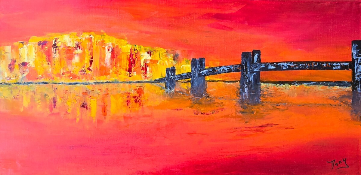 En juillet et Août 2022, j'ai réalisé mes premières huiles au couteau ("le pont japonais" et "soleil couchant") lors de stages avec Bettina Delaere, artiste peintre à Fleurance.