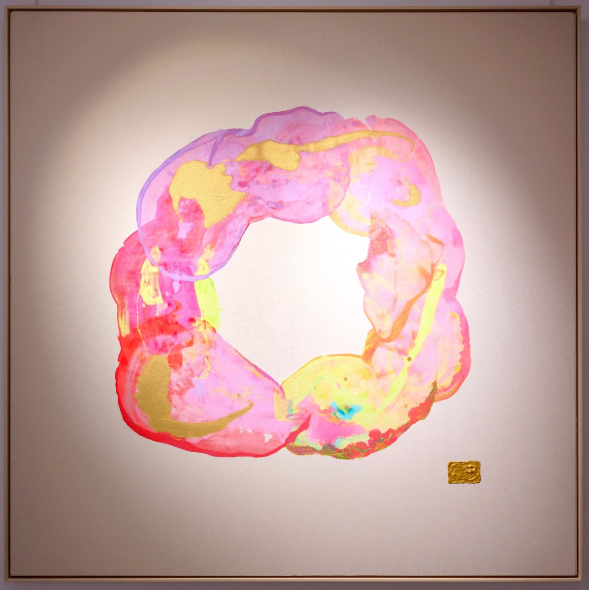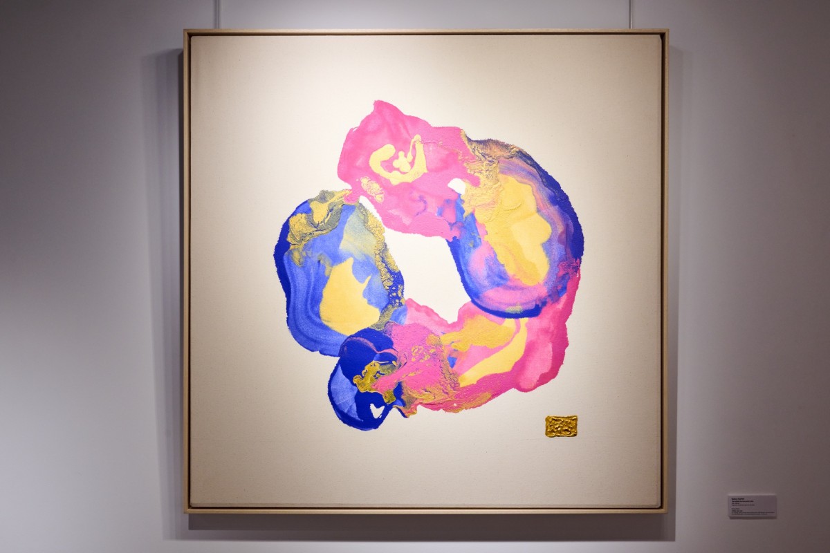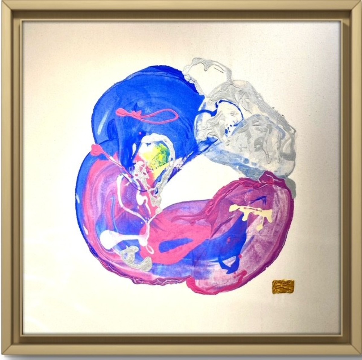 Le rose embrasse le jaune, le bleu chuchote à l’or, et l’espace vide devient un lieu de présence.