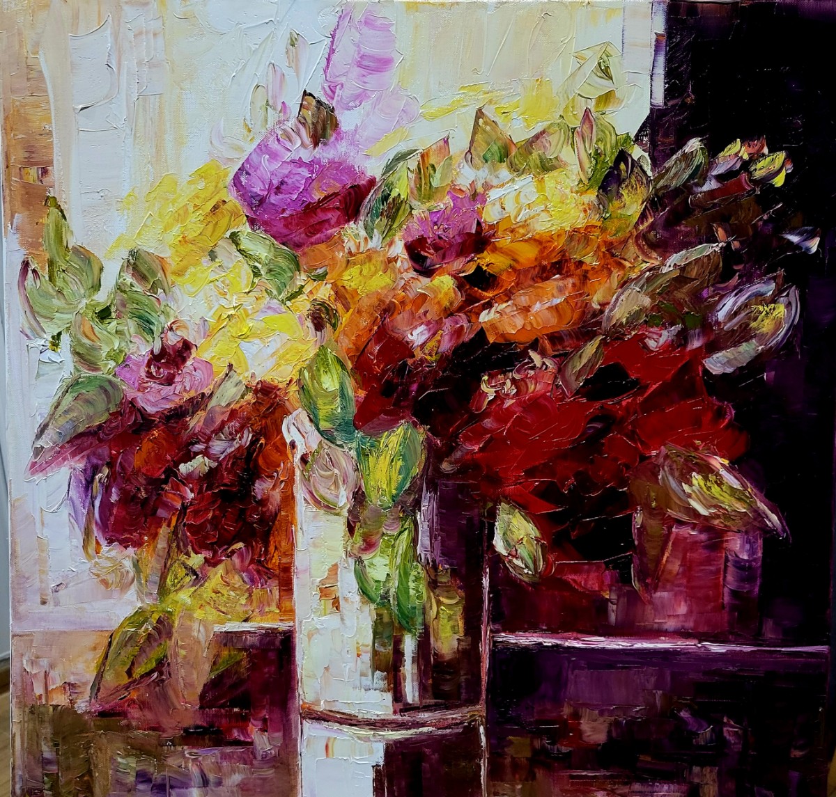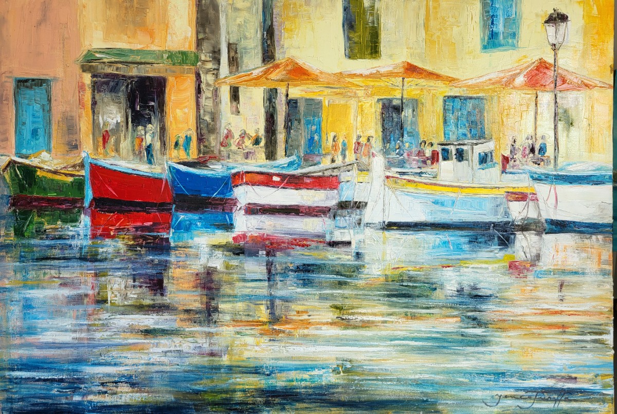Mes premières toiles réalisées à l’huile se sont enrichies au fil du temps de nouvelles matières, collages, écritures, pigments et de nouveaux outils : couteau, color shaper… avec toujours une prédilection pour la lumière et les couleurs fortes.