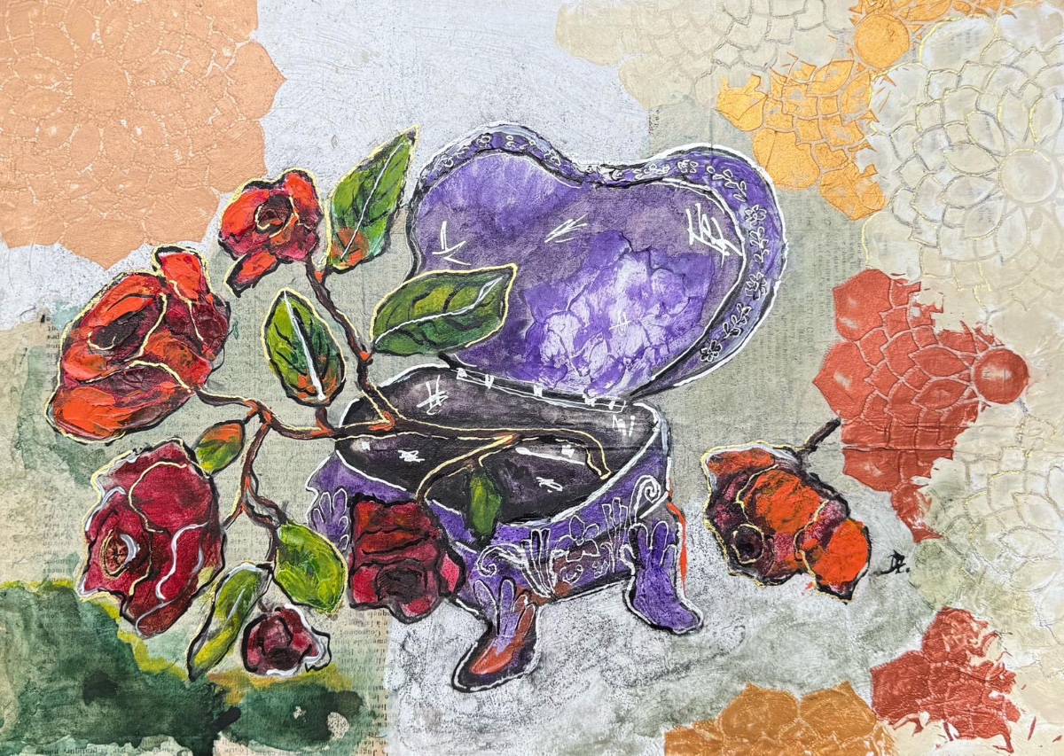 Son travail fusionne peinture, dessin, collage, textile et feuille d’or, dans une recherche plastique axée sur la mémoire culturelle, le symbolisme néolithique et la figuration contemporaine.